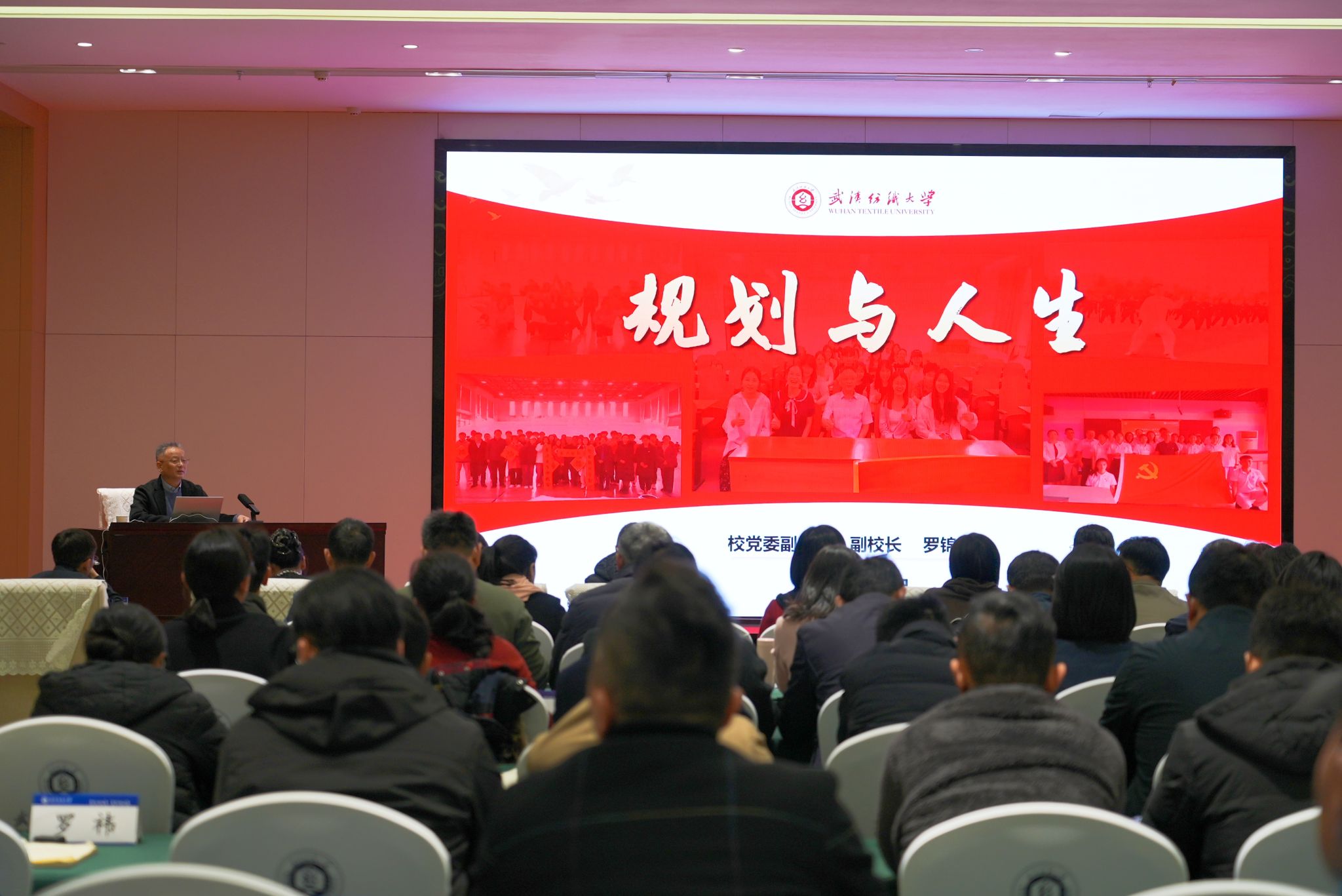 为深入学习贯彻党的二十届四中全会精神,落实校党委“书记开讲啦”活动要求,加强学生工作队伍建设,11月25日下午,“书记开讲啦”暨辅导员“素质能力提升”培训第二讲在阳光校区建全会堂举行,校党委副书记、副校长罗锦银结合自身三十七载育人路的初心回望,以《规划与人生》为题,面向学校“大思政、大学工”系统作主题培训、专题宣讲。校党委组织部、统战部、宣传部、学工部、研工部、保卫处、团委、就业处、校友处全体人员,各二级学院党委副书记及全体辅导员参加会议,共学全会精神、共绘育人蓝图。