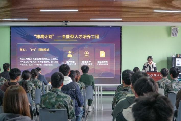 国防迷彩团副团长谈立璟作2025年工作总结汇报。过去一年,团队凝心聚力、真抓实干,圆满完成了湖北省2026年征兵宣传启动仪式志愿服务、国防教育馆参与建设、征兵宣传动员、新生军训辅训、社团招新换届、雏鹰计划训练等六项核心任务,用实际行动践行迷彩使命。在组织建设方面,团队精准实施架构优化调整,进一步明晰了权责边界,理顺工作流程,提升管理效能,为后续高质量发展筑牢了坚实的组织根基。