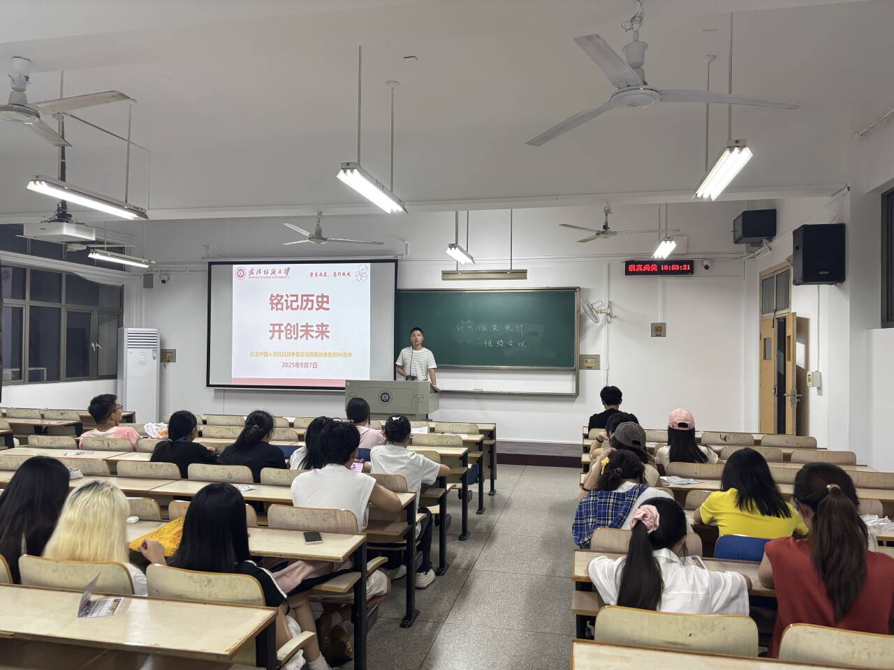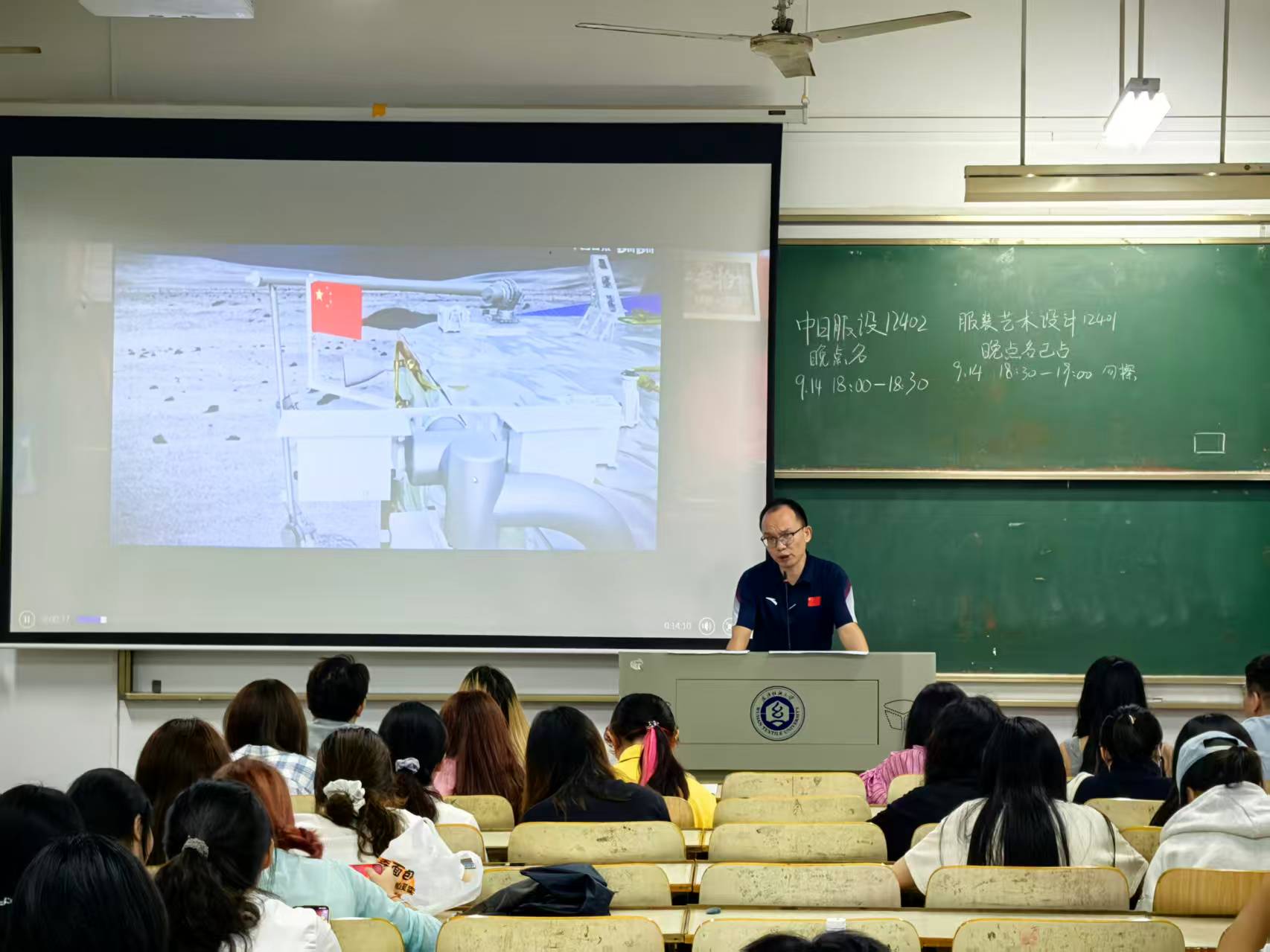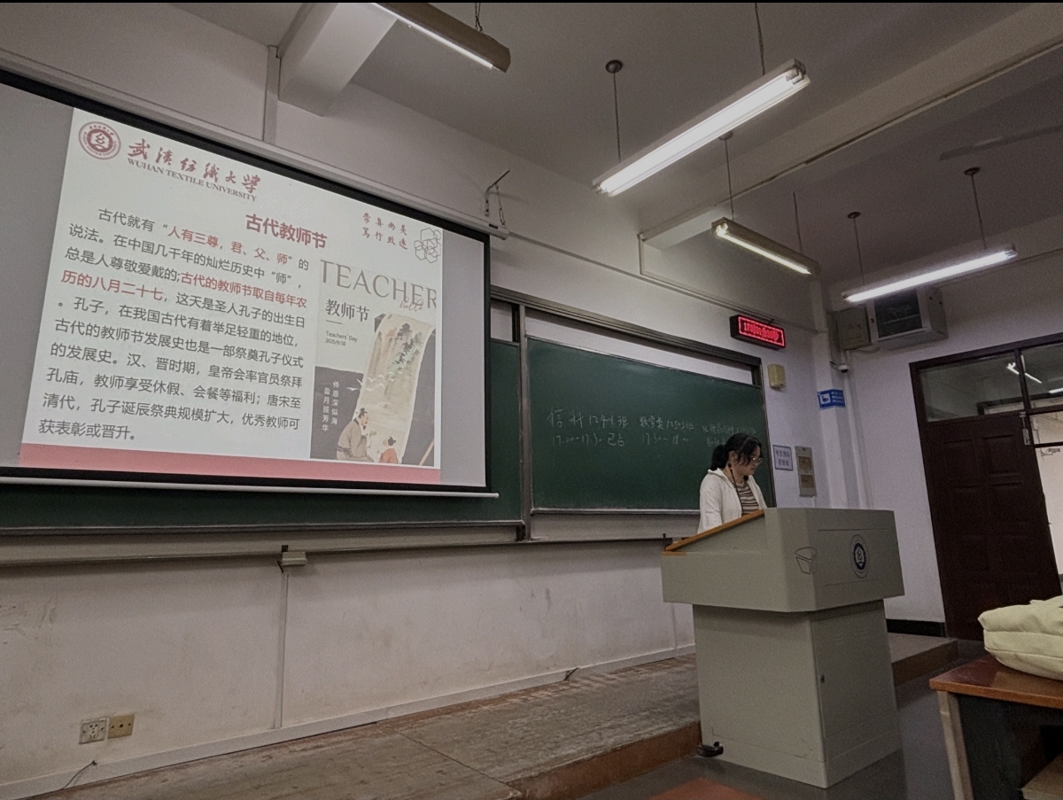 庆祝纺大校庆,厚植尊师文化。班会还特别分享了武汉纺织大学2025年教师节庆祝大会的精彩内容:首映主题微电影《传旗》,取材校园真人真事,以国旗护卫队、月面国旗团队等故事,诠释“韧、忍、仁”的纺大精神与教育家担当;