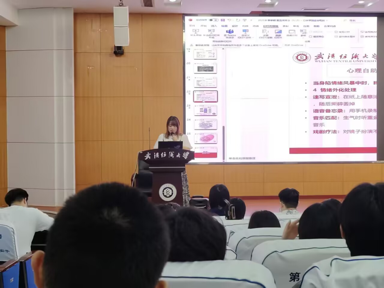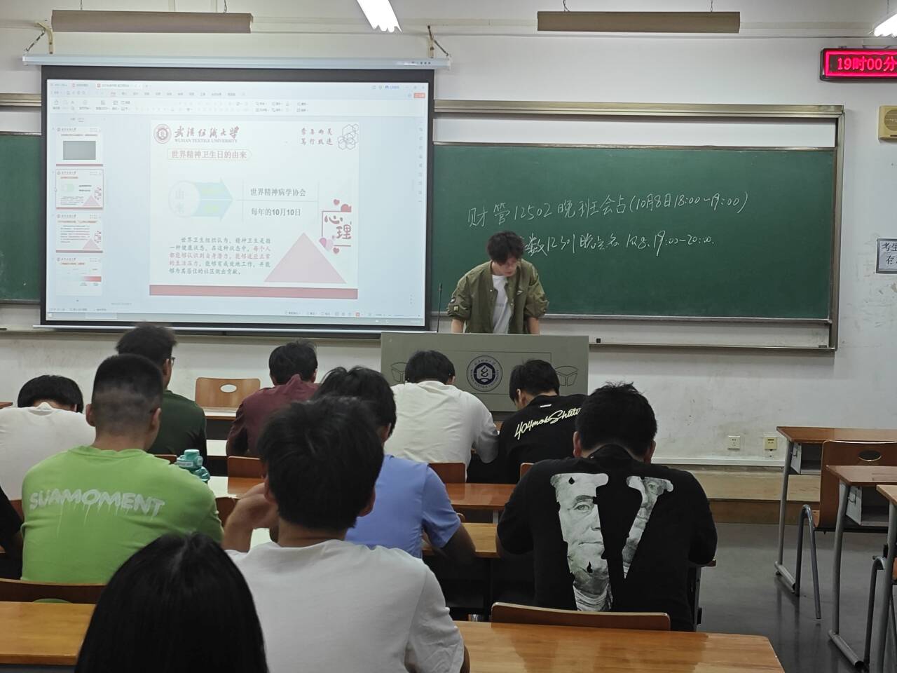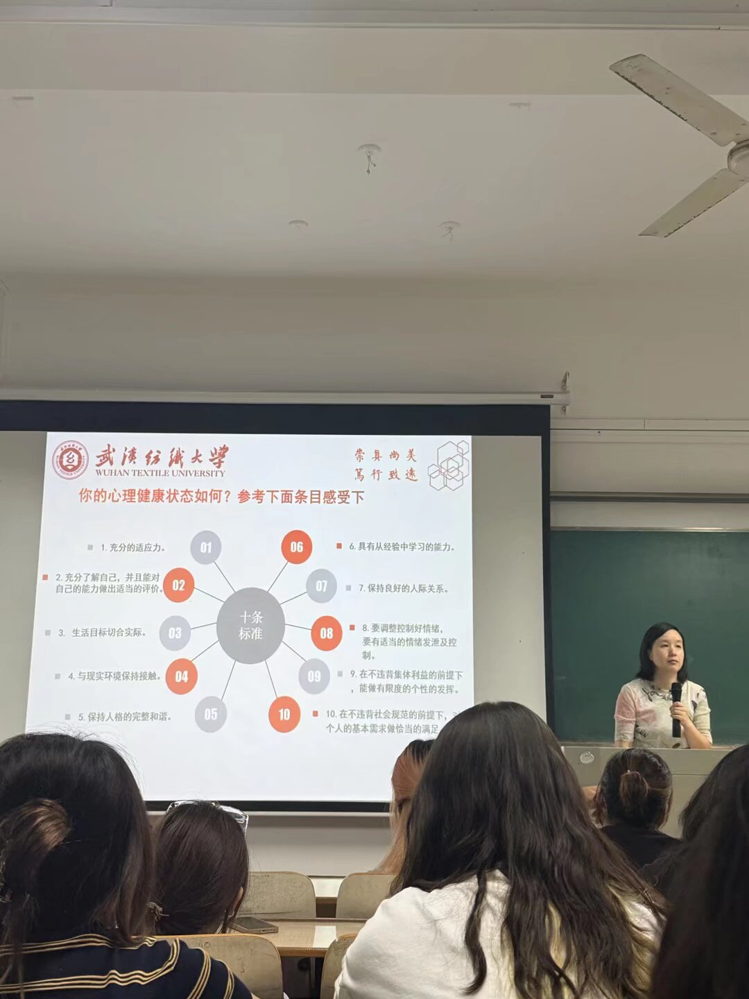 同时,主持人介绍了心理健康的十条标准,包括充分了解自己、生活目标切合实际、与现实环境保持接触等,引导学生正确认识自己的心理健康状态。在心理专业求助途径方面,辅导员曾琦详细介绍了校内和校外的求助渠道。校内求助包括预约电话、QQ预约、预约地址、咨询地点、校内精神科医生坐诊时间和校内心理危机干预热线等;校外求助包括全国统一心理援助热线、湖北省高校心理健康热线、全国免费心理危机干预热线、武汉市精神卫生中心热线以及相关医疗资源。