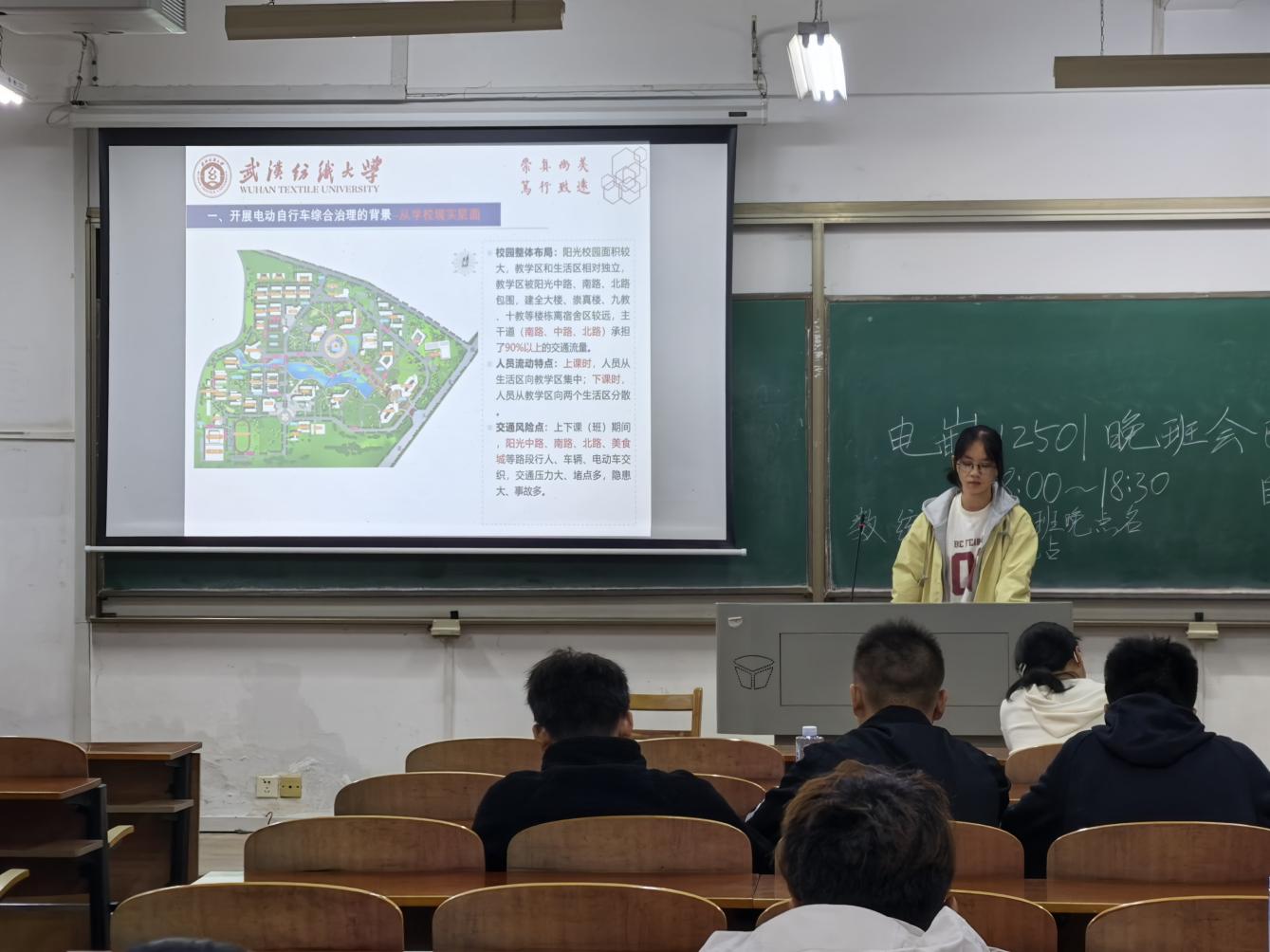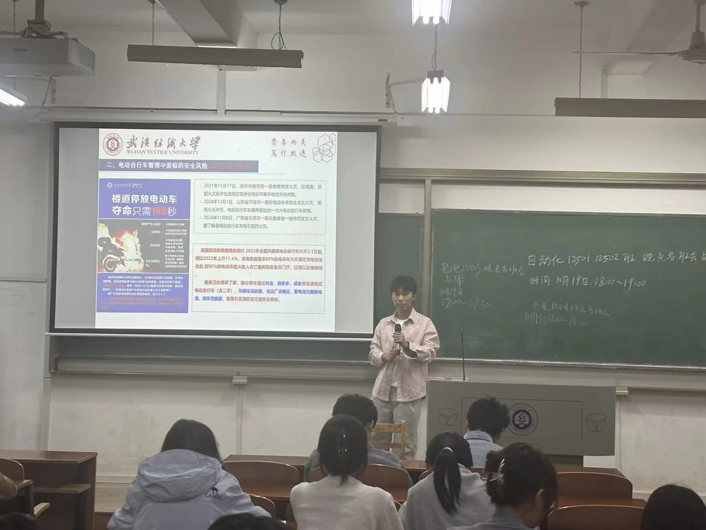 班会播放了其他高校火情视频,结合我校此前发生的电动自行车碰撞致伤案例,直观展示违规停放、充电带来的风险,解读了我校制定的《武汉纺织大学电动自行车管理办法》和采取的治理措施,学校也将启动第三轮实名登记授牌,清理不合规车辆。针对学生关心的“共享电动车高峰期不够用”“充电设施位置”等问题,老师们逐一回应,明确学校将根据潮汐规律增加车辆调度频次、优化停车区域规划,并呼吁学生优先选择共享车辆或步行出行。