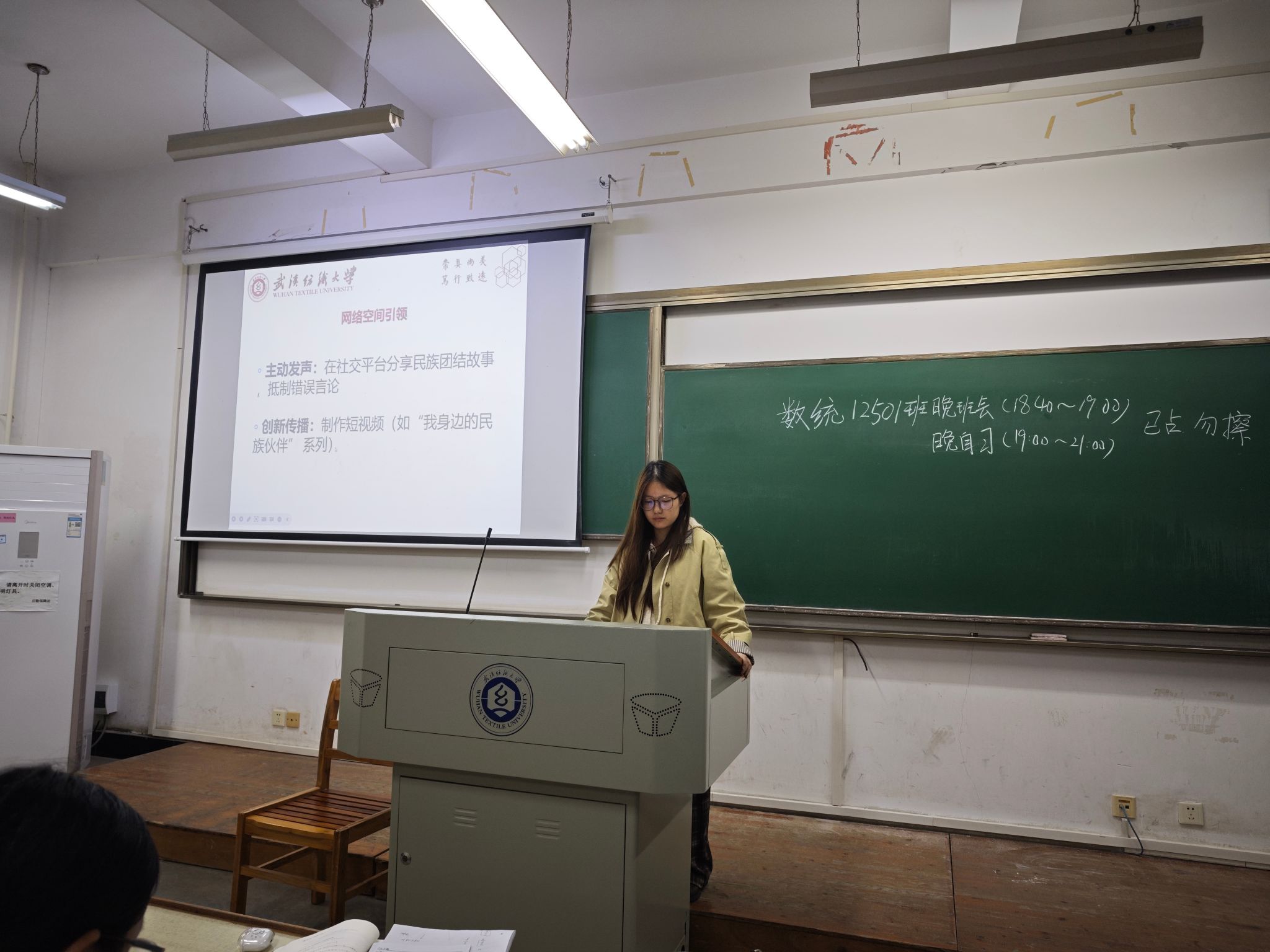 各年级班主任们通过PPT展示等形式,清晰解读“中华民族共同体意识”的核心概念,点明其是以爱国主义为核心,强调各民族 “休戚与共、荣辱与共、生死与共、命运与共”。在时代意义层面,班主任们强调,铸牢中华民族共同体意识,对国家而言是维护统一、防范民族分裂思想渗透,推动高质量发展的基石;对大学生自身而言,是理解多元文化,提升跨文化沟通能力,将个人理想融入民族复兴,实现个人价值与国家发展同频共振的必然要求。最后,围绕“如何践行”,班主任们提出具体路径:一是推动课堂内外融合,将理论学习与民族文化活动相结合;二是深化实践与服务,鼓励参与民族地区调研、志愿服务等活动;三是强化网络空间引领,自觉抵制错误言论,传播民族团结正能量。