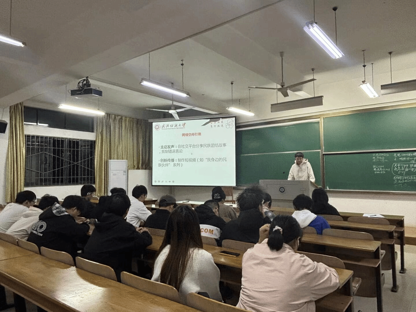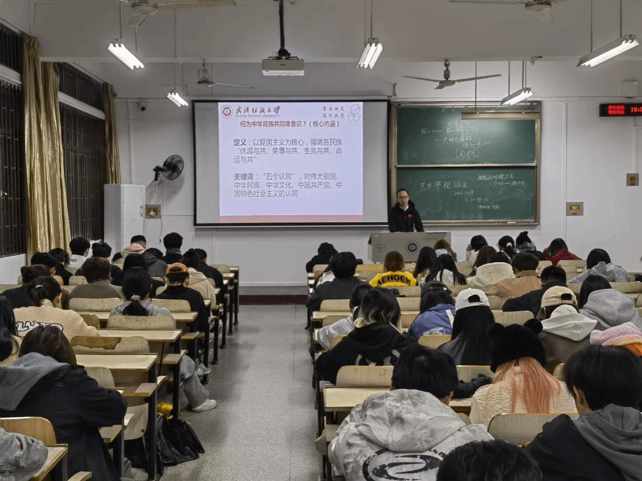 随后,各班围绕 “大学生如何践行中华民族共同体意识” 展开讨论。同学们结合课堂学习与课外实践分享观点,提出要在思政课、专业课中主动学习民族团结知识,选修《中华民族共同体概论》等通识课程;积极参与 “三下乡” 社会实践,调研民族地区非遗保护;在网络空间主动分享民族团结故事,抵制错误言论。班主任对同学们的发言进行总结,勉励大家以实际行动践行 “中华民族一家亲,同心共筑中国梦” 的理念,从身边小事做起,尊重多元文化,主动参与校园民族团结相关活动。