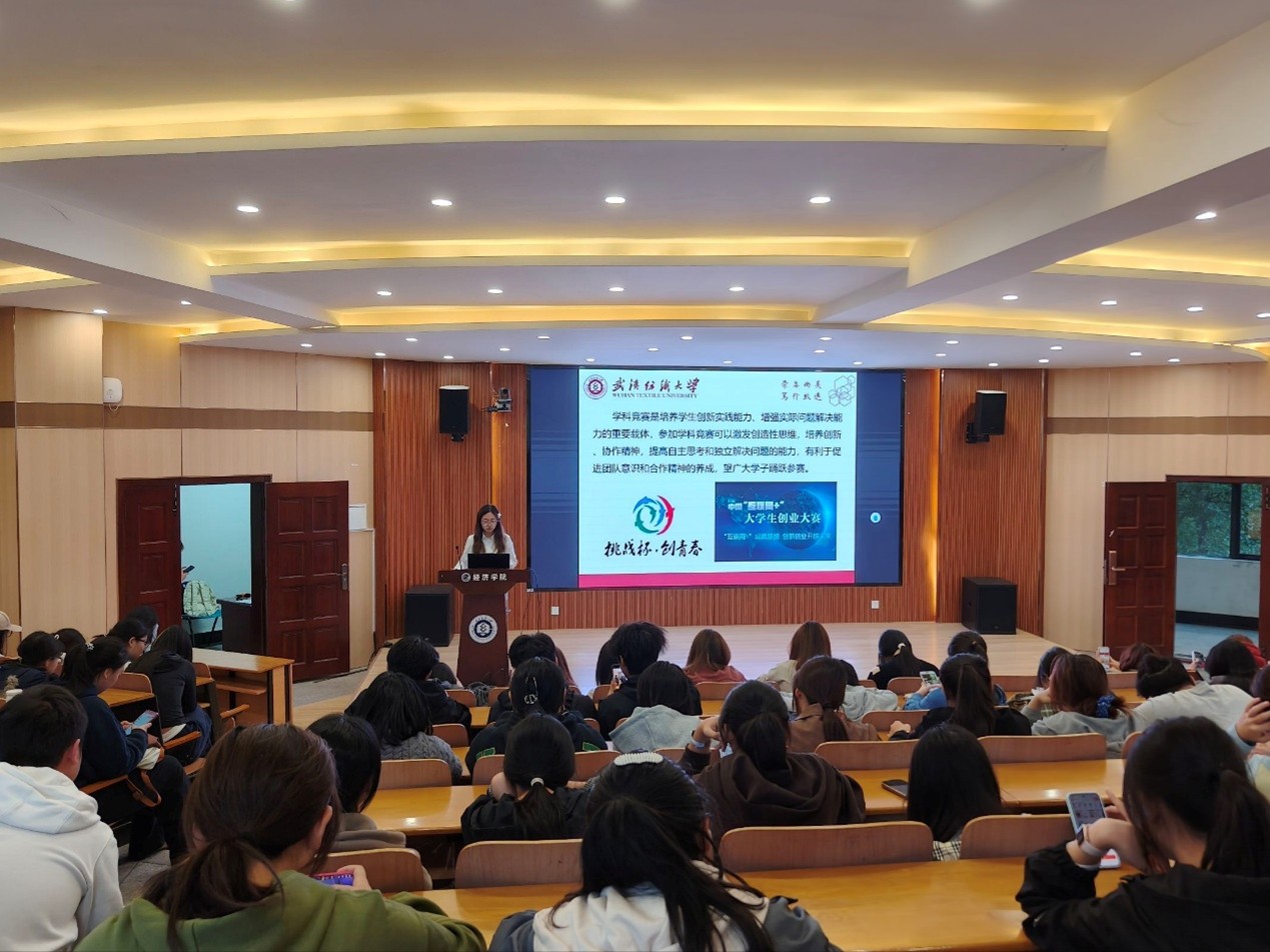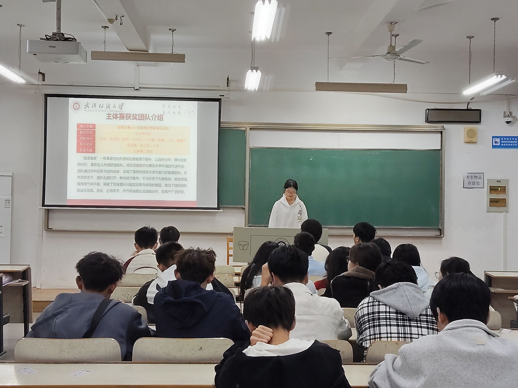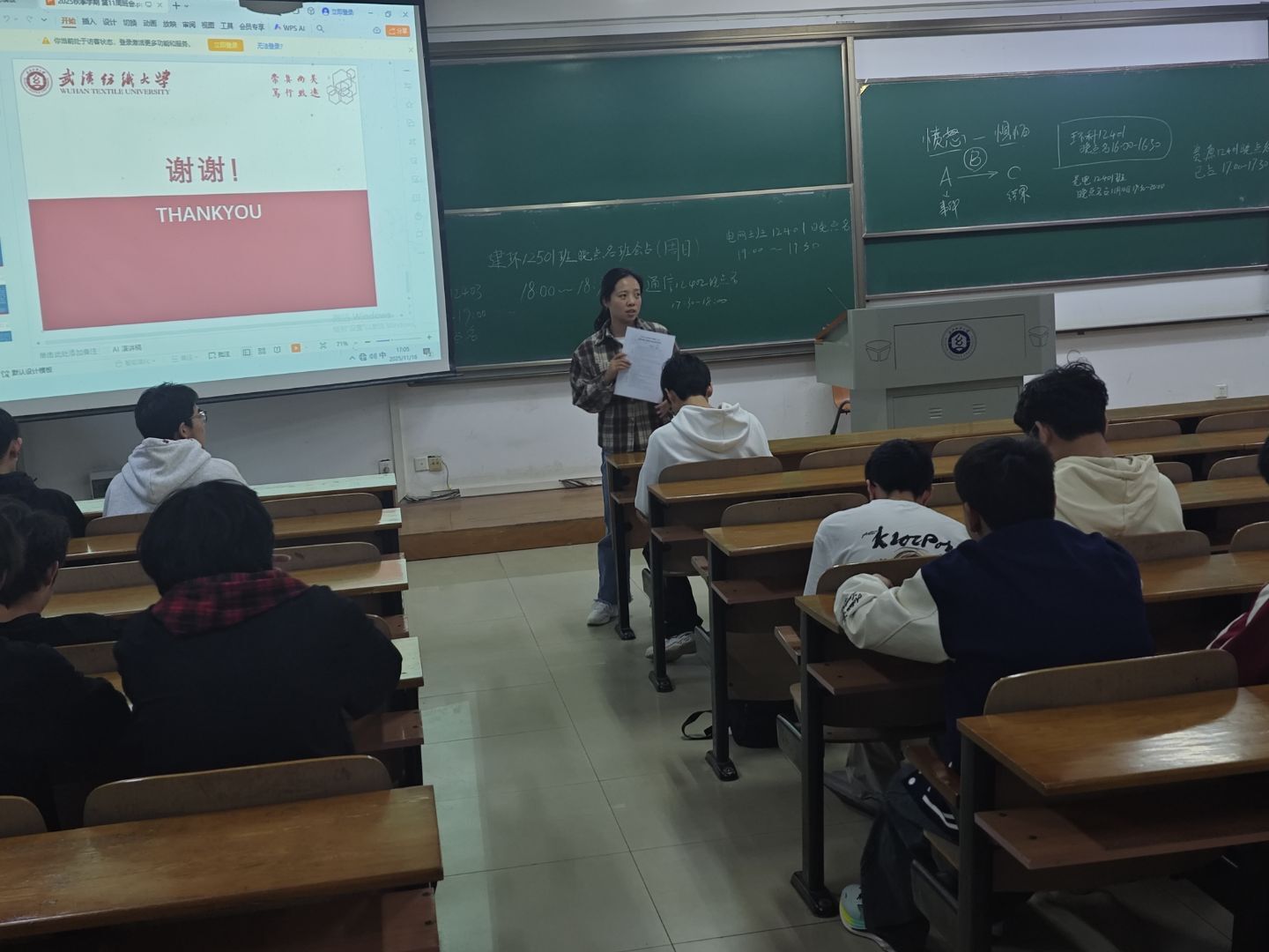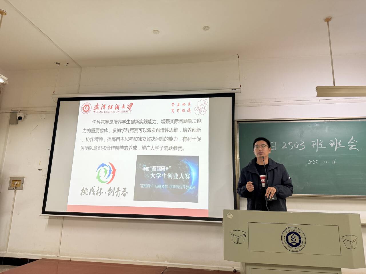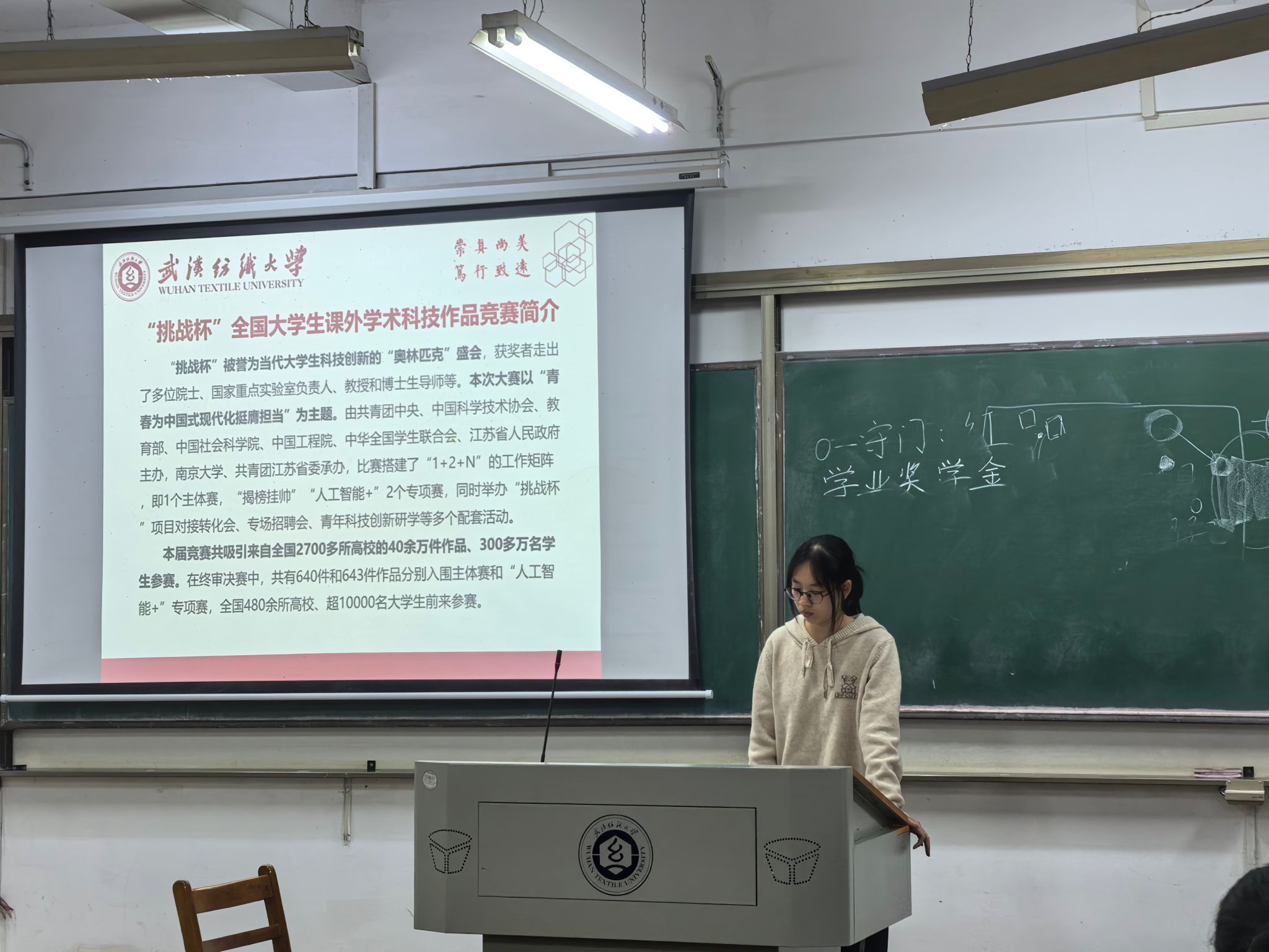 班会伊始,各班主持人带领同学们学习习近平总书记给青年科技人才的寄语,围绕科创人才核心素养,结合时代背景阐释“科创强基”的深刻内核。随后,与会辅导员和班主任老师强调学科竞赛在青年担当培育中的重要作用,列举各类科创大赛项目,鼓励同学们积极参与。最后,重点介绍“挑战杯”赛事的地位、内容及涵盖范围,详细分享获奖团队与项目案例,并展示武汉纺织大学在该项赛事中的亮眼佳绩,以此激励同学们以榜样为引领,踊跃参赛、奋勇争先。