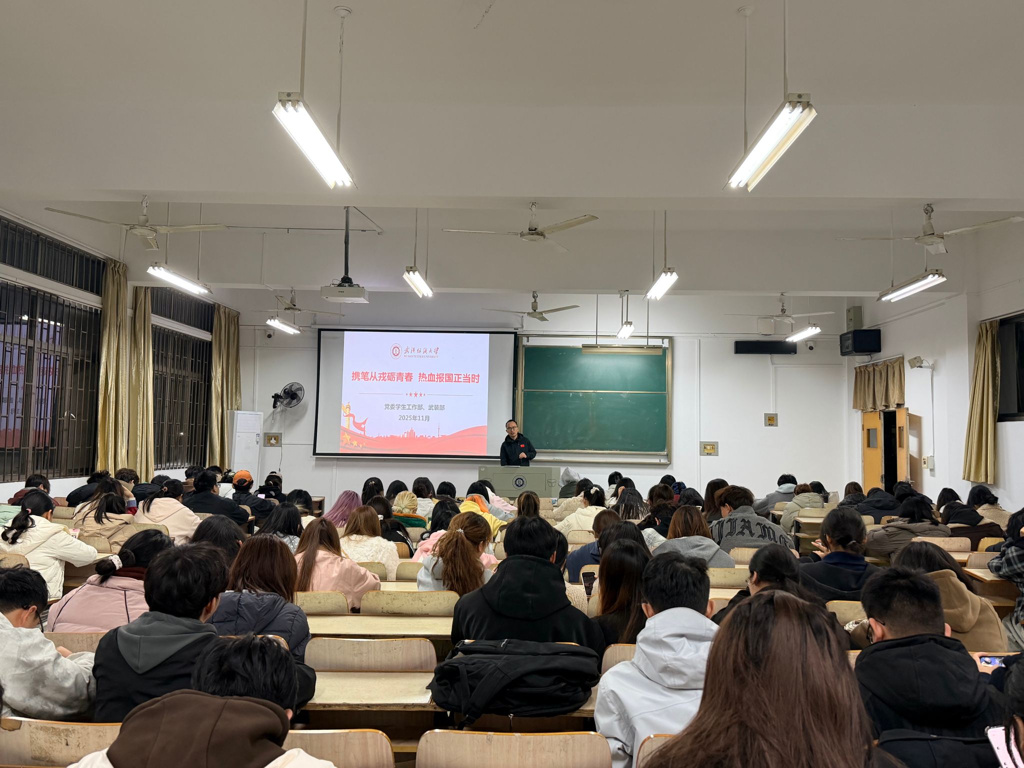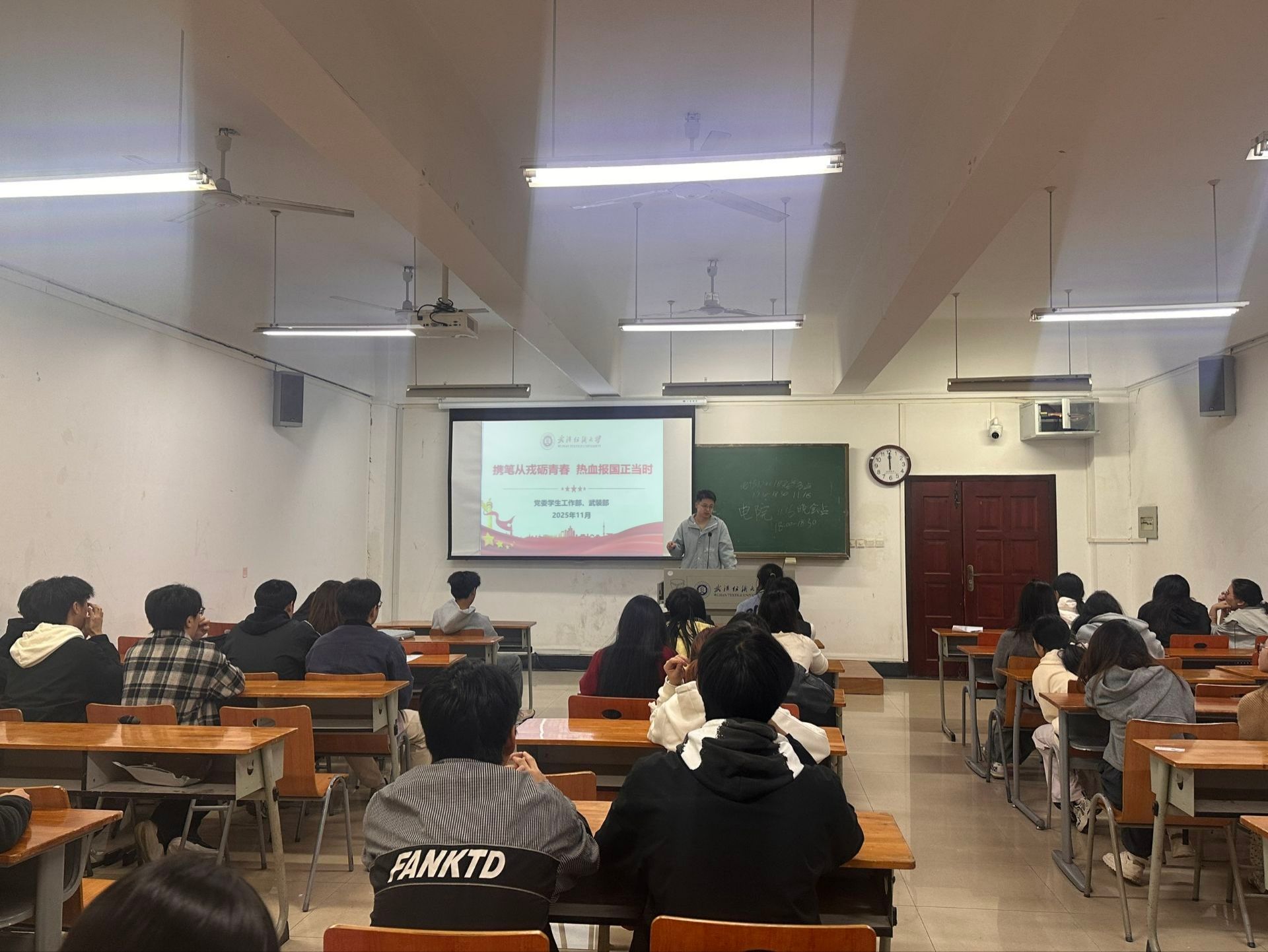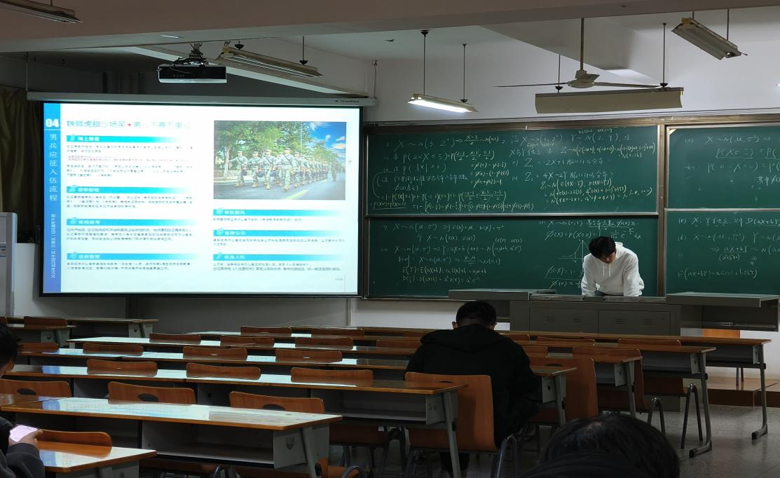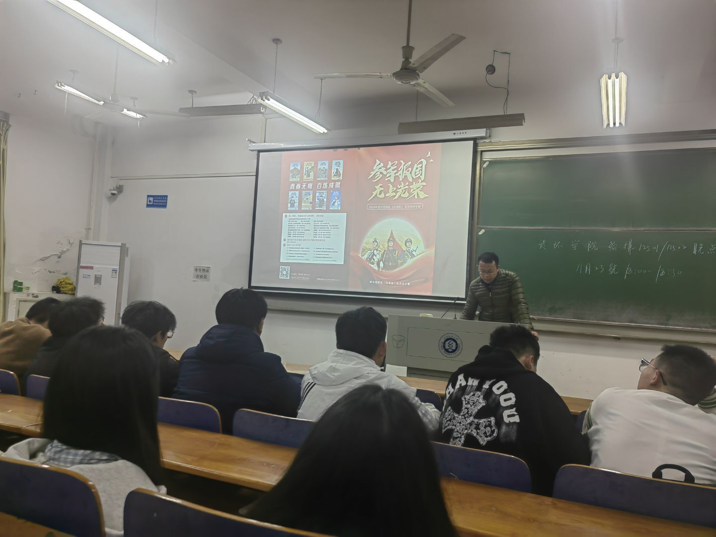 11月23日,学院在崇志楼各晚点名教室开展“携笔从戎砺青春 热血报国正当时”主题班会,围绕2026年征兵工作相关政策、流程及要求,面向各年级学生开展专项宣传动员,引导青年学子响应国家号召,以青春之力投身国防事业。