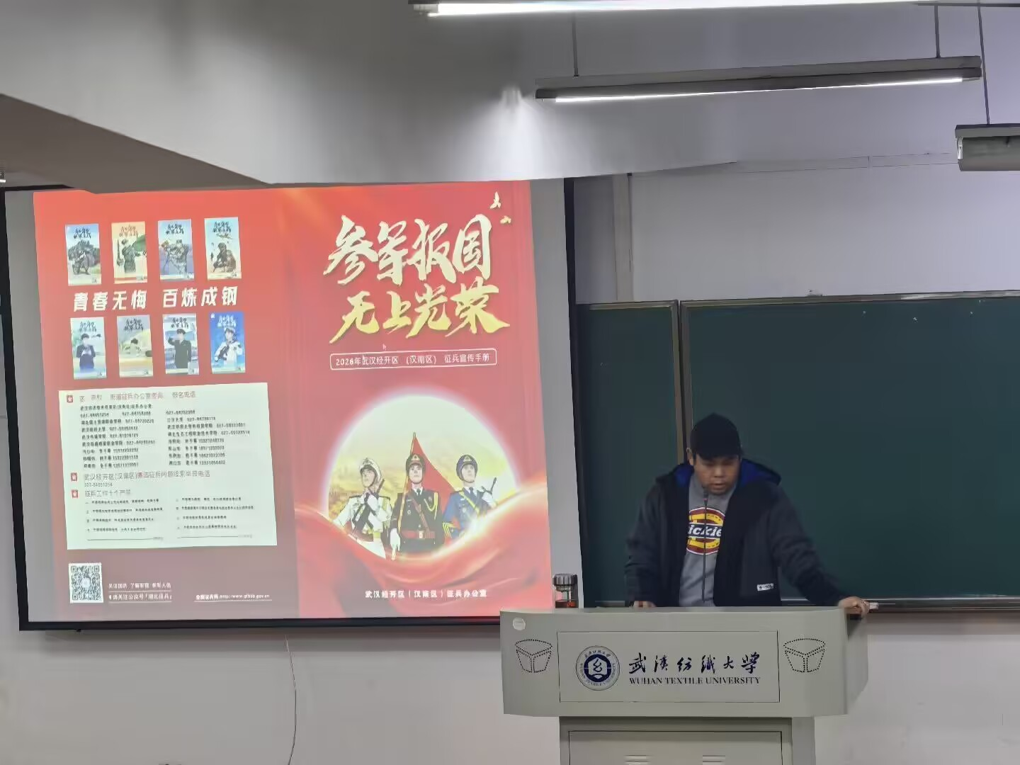 随后,各班简要介绍征兵政策后,退役士兵李若欣身着军装登台宣讲军旅生活。她以“青春献军营,科技助强军”为主题,结合自身服役经历,讲述在战略支援部队的两年时光。投影屏幕上,一组组鲜活的图片映入眼帘:李若欣身着迷彩服在发射站下的英姿、与战友执行通信保任务的专注神情。现场播放《武汉纺织大学2026年征兵宣传视频》,通过校园与军营的场景切换,展现“携笔从戎”的双重价值。最后,退役士兵李若欣现场解答同学关于军旅生活的问题,并发出“青春算法,强国有我”倡议,号召全体同学将个人成长融入国家战略,以热血点燃报国理想。