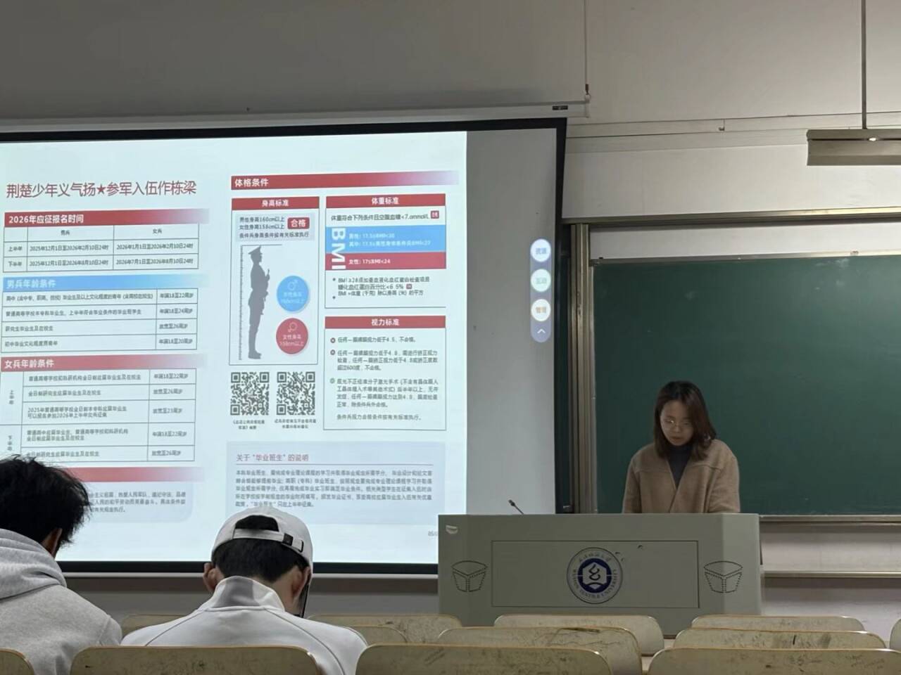 在政策解读环节,老师们详细解读了征兵宣传手册,系统讲解了2026年征兵工作的具体安排。内容涵盖入伍条件、报名流程、体格检查标准、政治考核要求等关键信息。针对大学生群体特别关注的学业保障政策,详细介绍了“专科生免试专升本”、“考研专项计划”等优惠政策,以及国家和湖北省出台的系列惠兵措施,包括义务兵津贴、军士工资待遇、退役安置保障等,让同学们深刻感受到“让军人成为全社会尊崇的职业”正在转化为实实在在的政策红利。