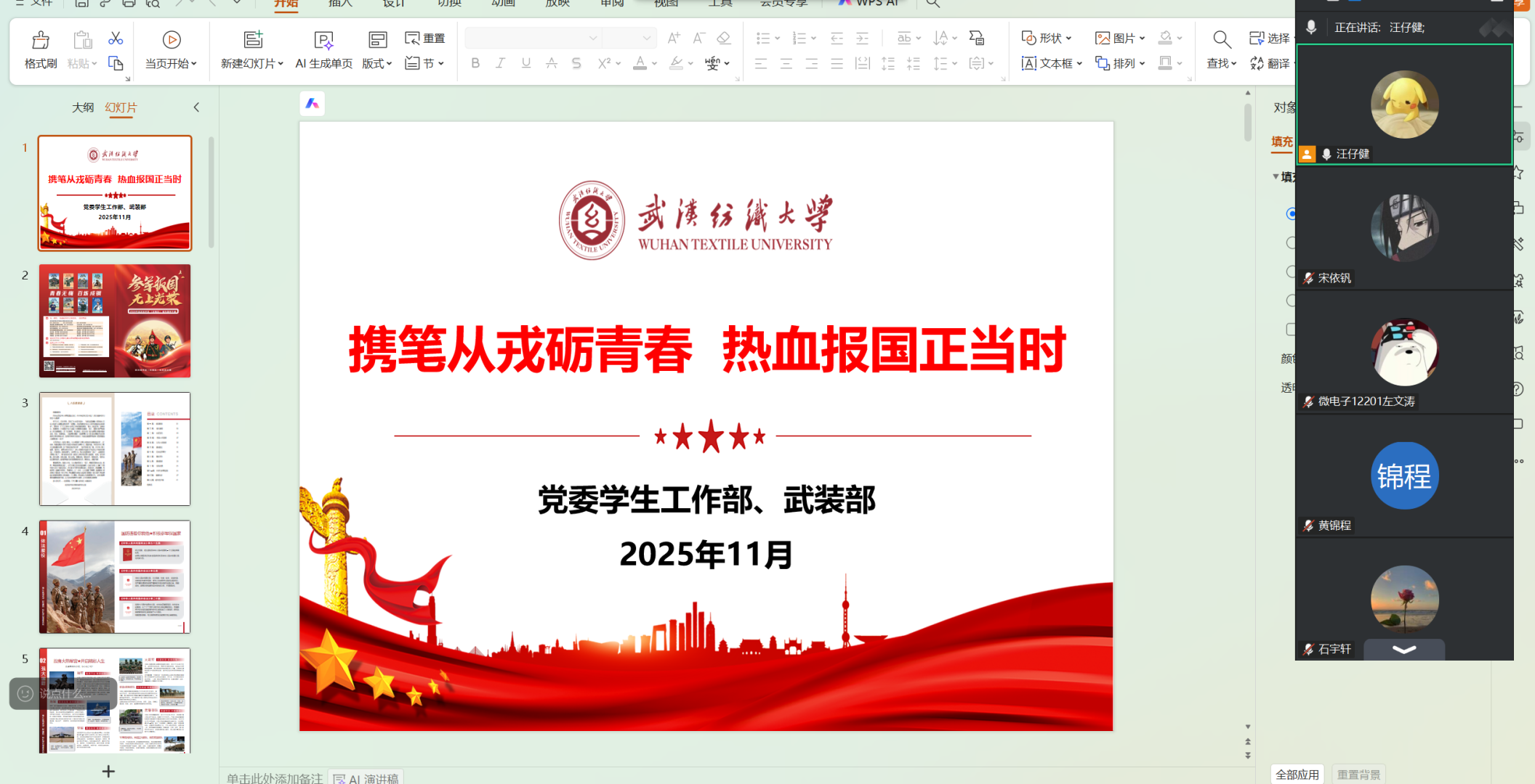 通过班会分享的政策解读、事迹分享和互动交流,相信更多的纺大学子对国防建设、参军入伍有了更全面的认识和更深刻的感悟。愿每一位同学都能以青春之我、奋斗之我,在人生的赛道上勇毅前行,用实际行动诠释新时代青年的责任与担当!让我们共同祝愿祖国山河无恙、国泰民安,也期待更多有志青年响应国家号召,携笔从戎,让青春在保家卫国的征程中绽放绚丽之花!