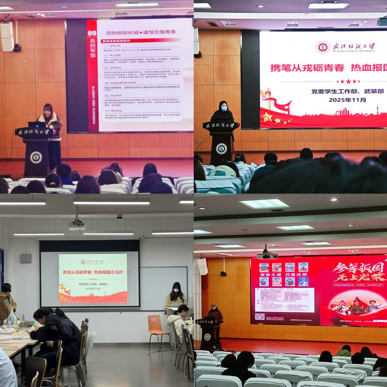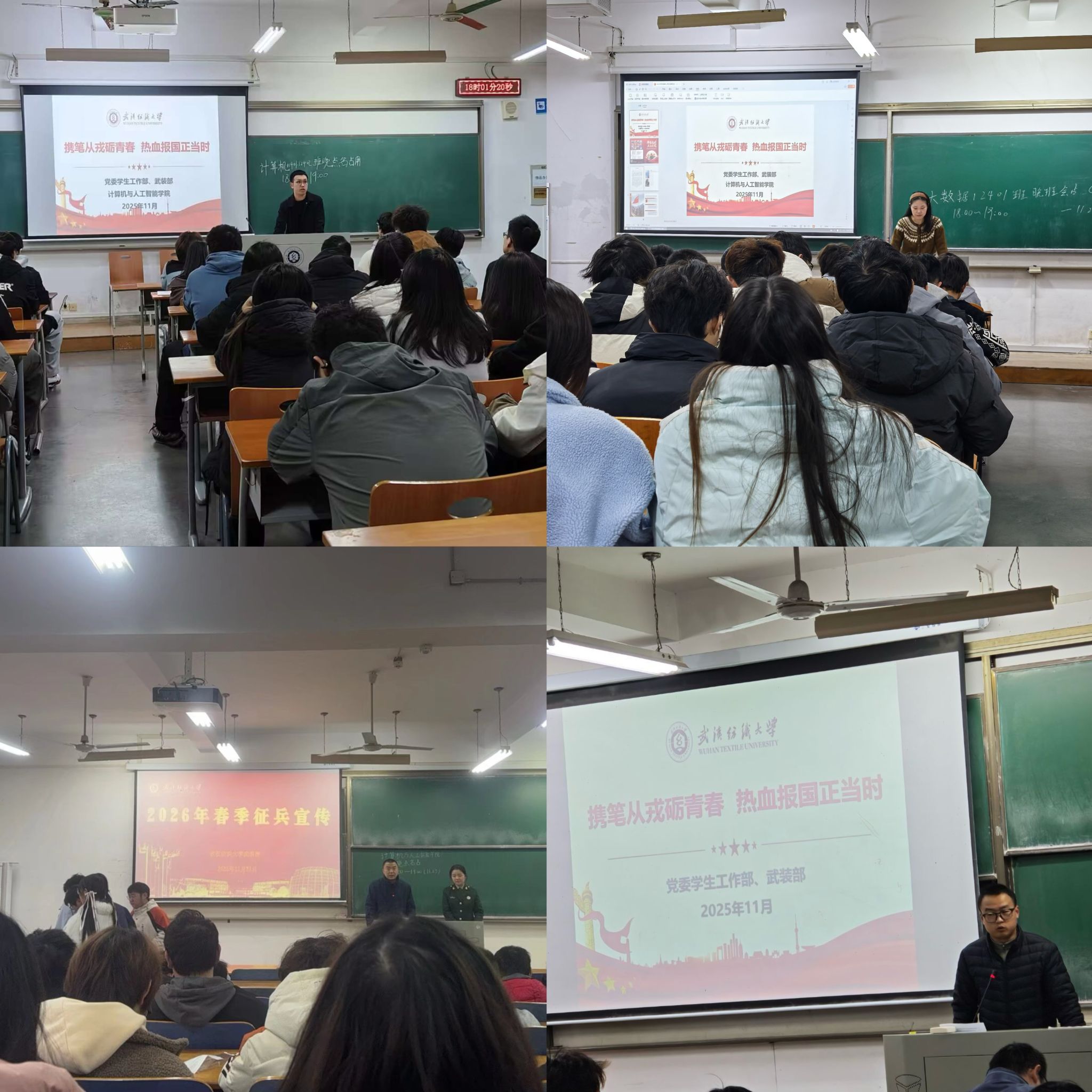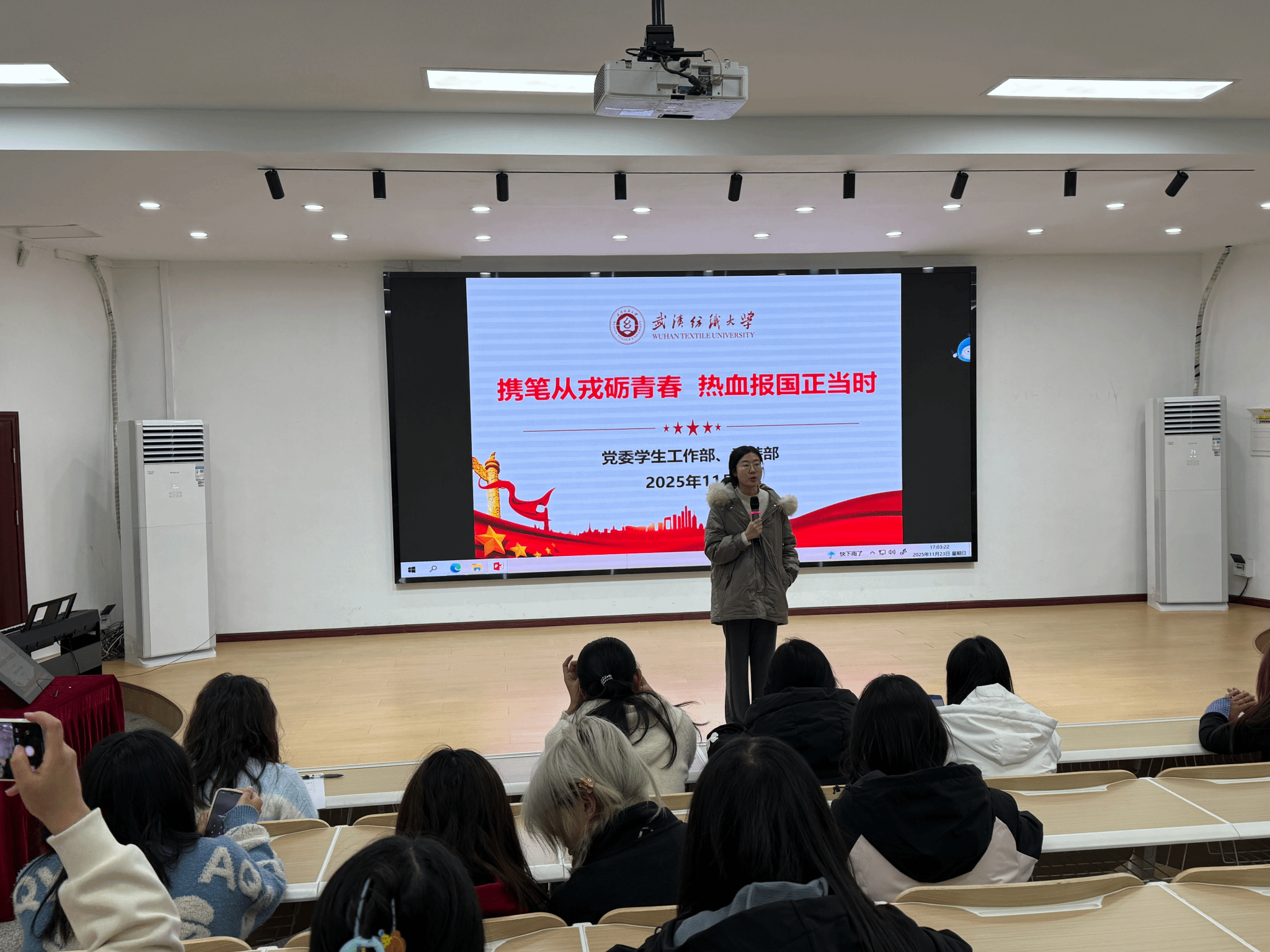 为积极响应国家征兵号召,扎实推进2026年春季征兵宣传工作,激发青年学子投身国防、报效祖国的热情,11月23日,纺织学院组织各班级开展“携笔从戎砺青春,热血报国正当时”主题班会。各班辅导员、班主任主持活动,全体本科生参与。