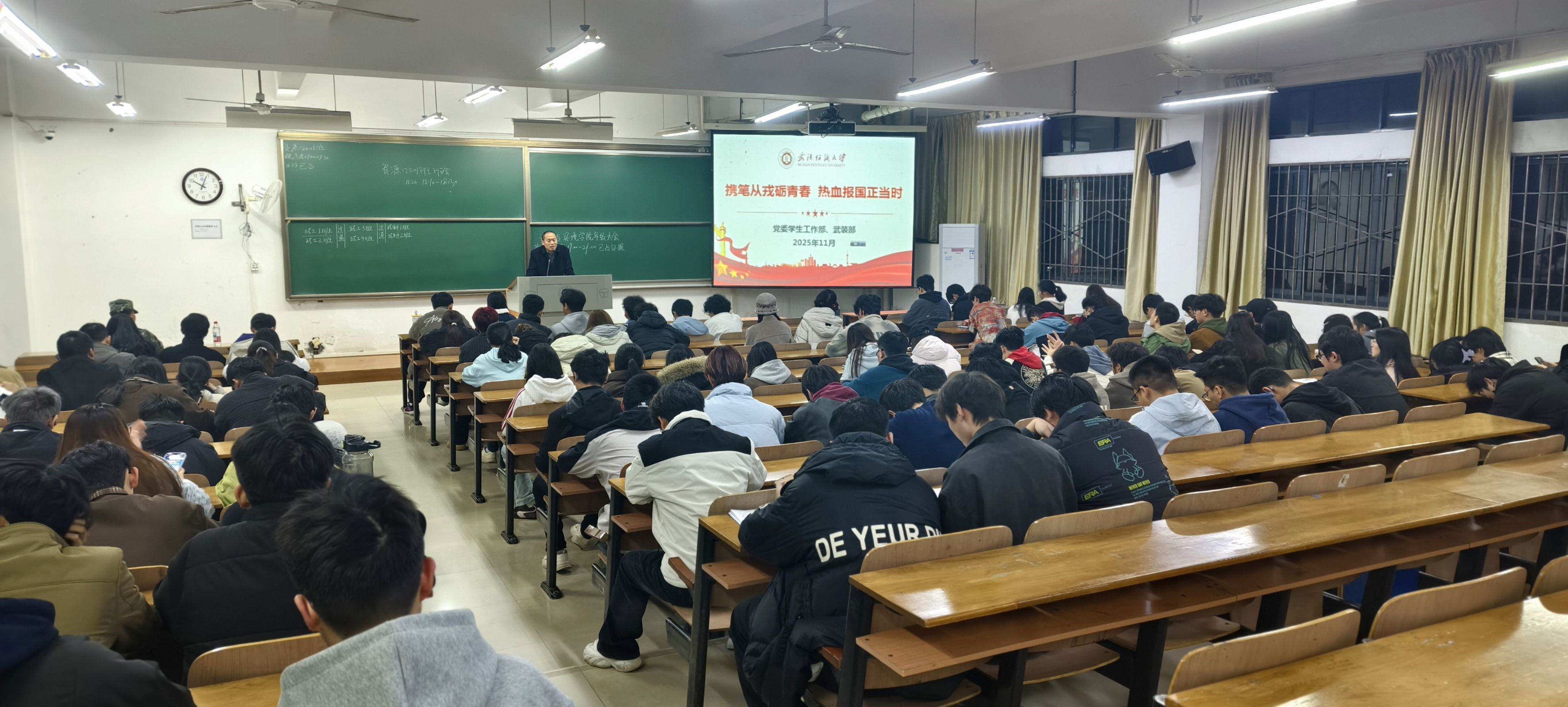 为深入贯彻新时代强军思想,积极响应国家征兵号召,11月23日,学院各年级研究生和本科生齐聚崇礼楼,隆重举行“携笔从戎砺青春 热血报国正当时”主题教育班会。本次班会旨在全面宣传征兵政策,引导广大学子树立强国强军信念,激发参军报国热情。