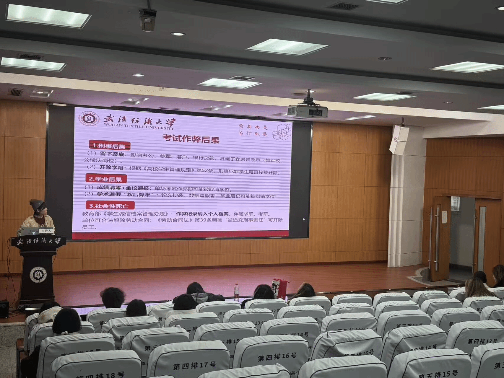 班会伊始,老师们强调诚信是做人之本、治学之基,更是科学精神的必然要求。随后,班会重点解读了考试作弊的法律后果与校纪校规:通过《中华人民共和国教育法》相关条款解析,明确组织作弊、替考、非法出售试题等行为已构成刑事犯罪,最高可判七年有期徒刑;结合《武汉纺织大学学生考试违纪处理办法》,详细列明从警告到开除学籍的分级处分标准,用真实案例警示同学们切勿触碰红线。