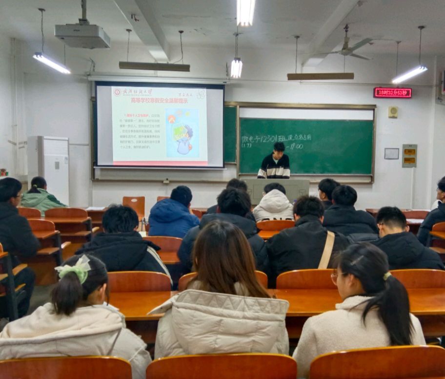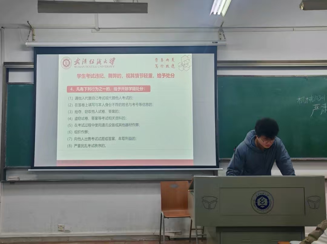 辅导员结合《中华人民共和国教育法》《武汉纺织大学学生考试违纪处理办法》等规定,明确了考试作弊的法律与校纪后果:从“考试作弊已入刑”的法律责任(如拘役、管制),到“取消成绩、警告直至开除学籍”的校纪处分,再到影响升学、就业的长远隐患,帮助同学们清晰知晓诚信考试的“高压线”。