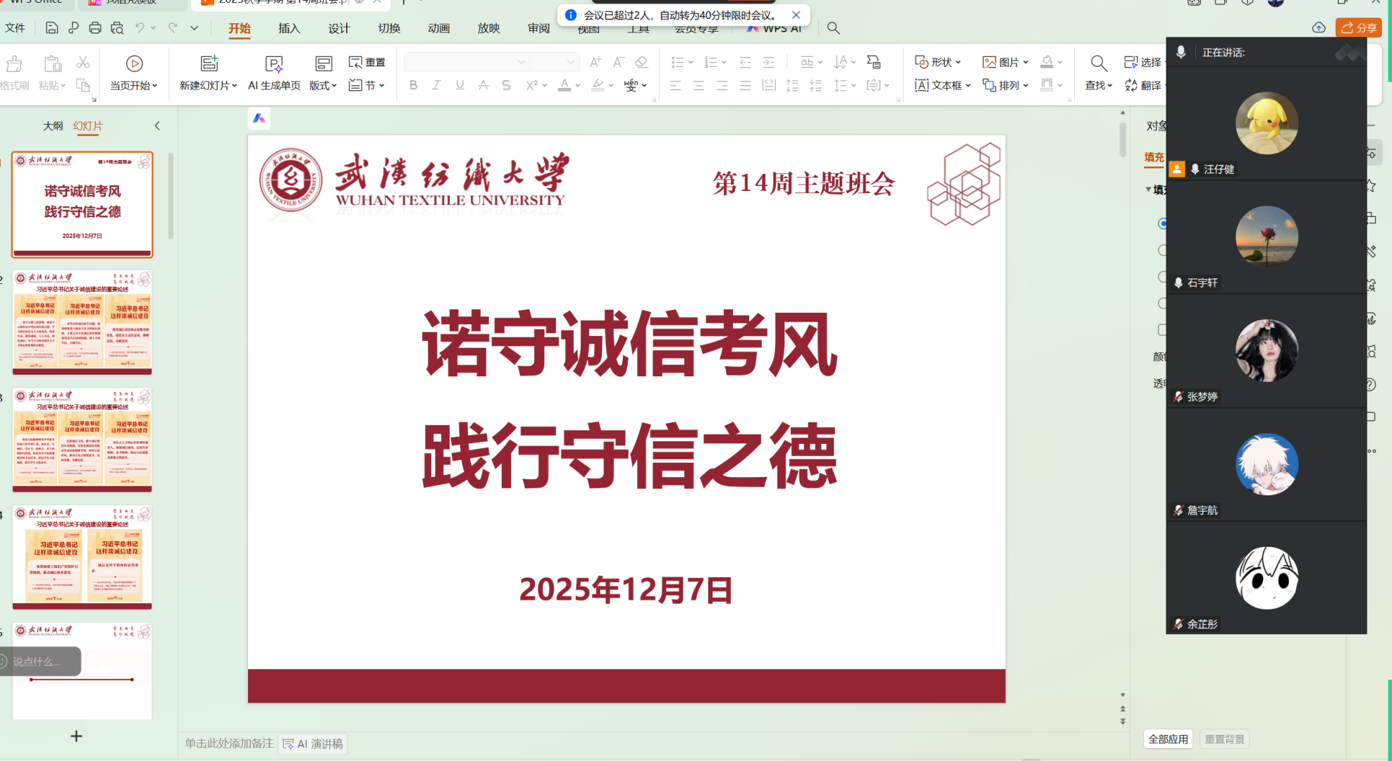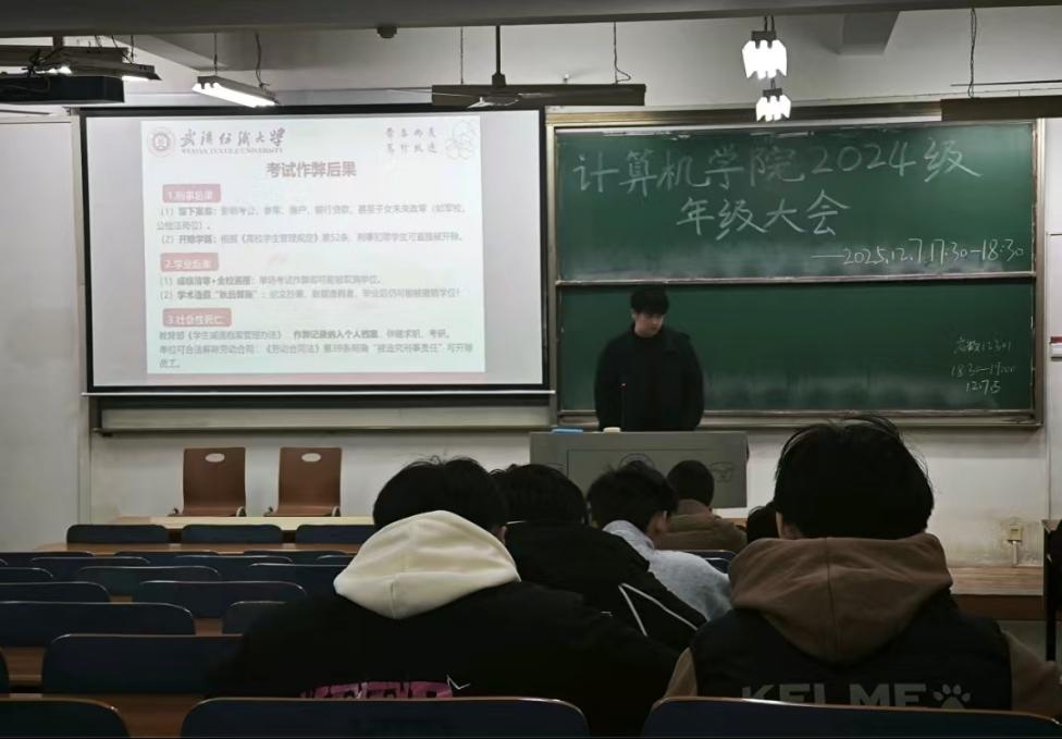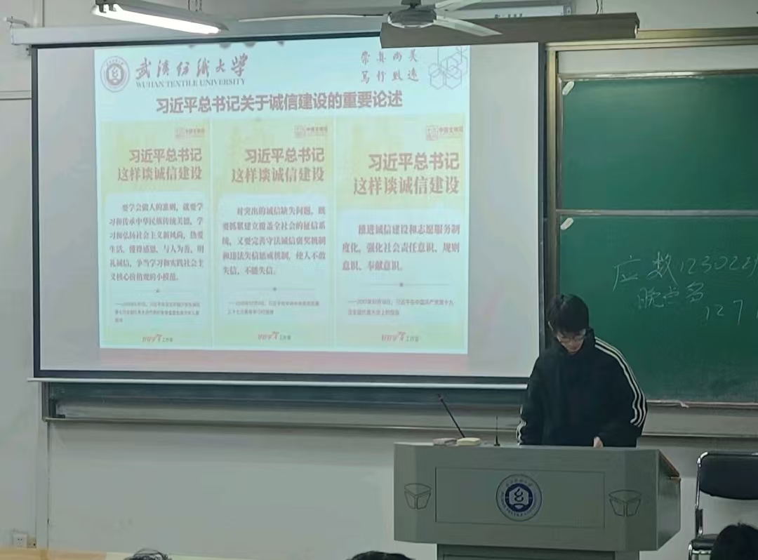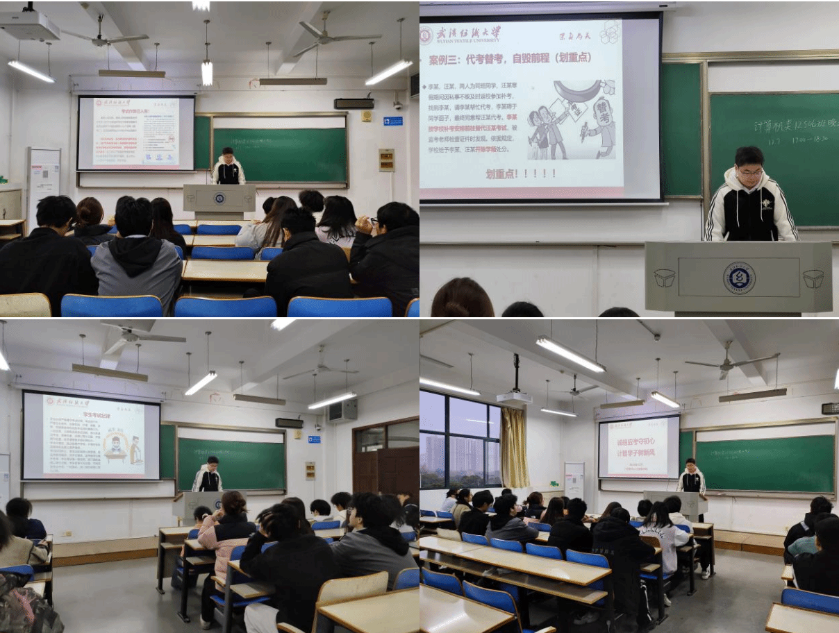 为强化学生诚信考试意识,营造公平公正的校园考试氛围,12月7日晚,武汉纺织大学分年级开展第14周晚点名活动暨”恪守诚信考风 践行守信之德“主题班会。本次活动以“恪守诚信考风 践行守信之德”为核心,通过理论学习、案例警示、备考指导等内容,推动诚信理念入脑入心。