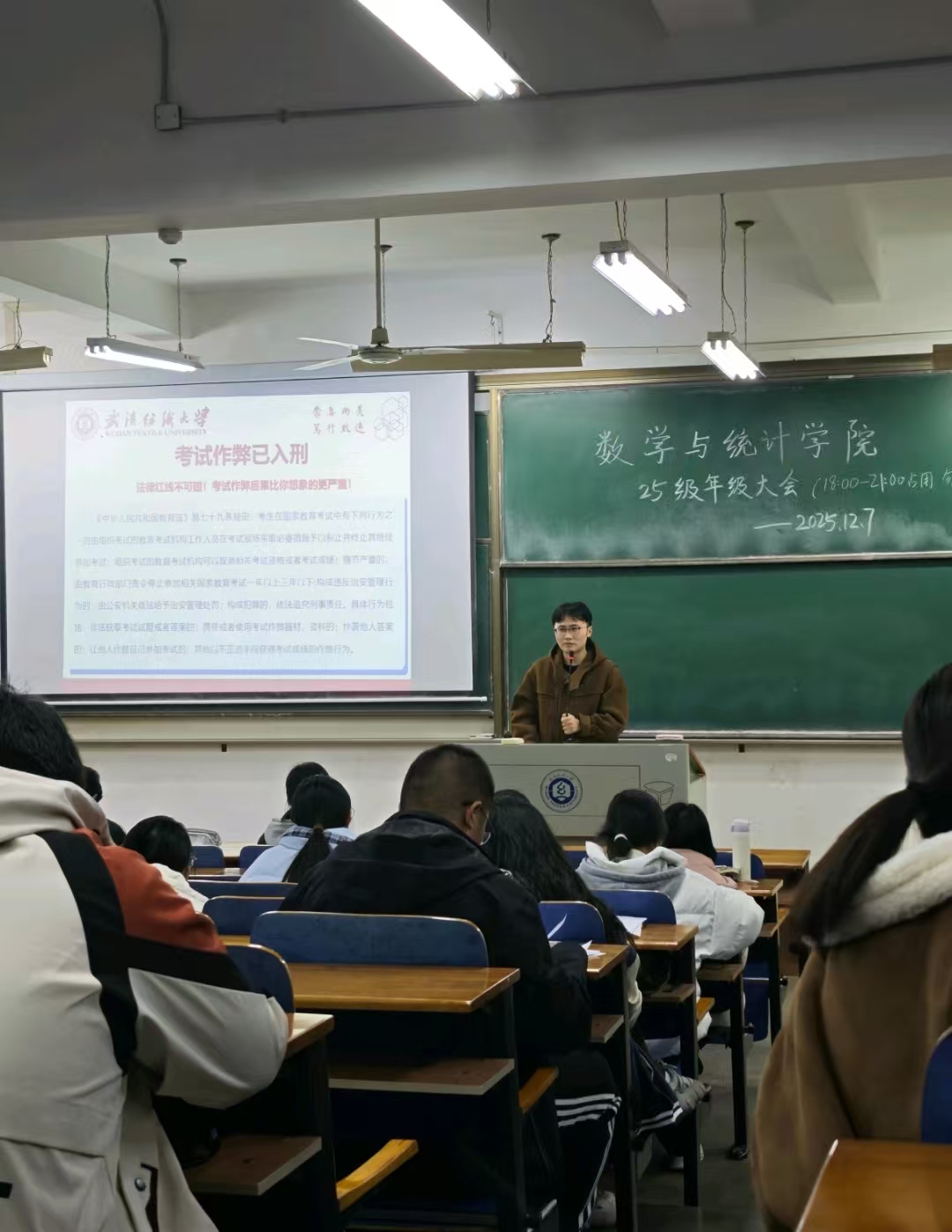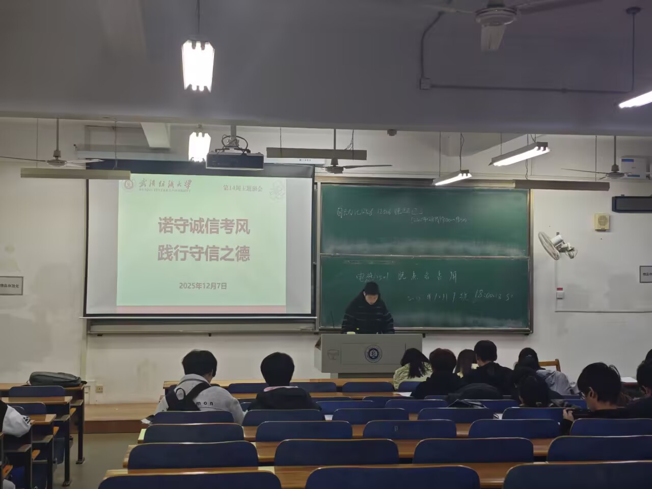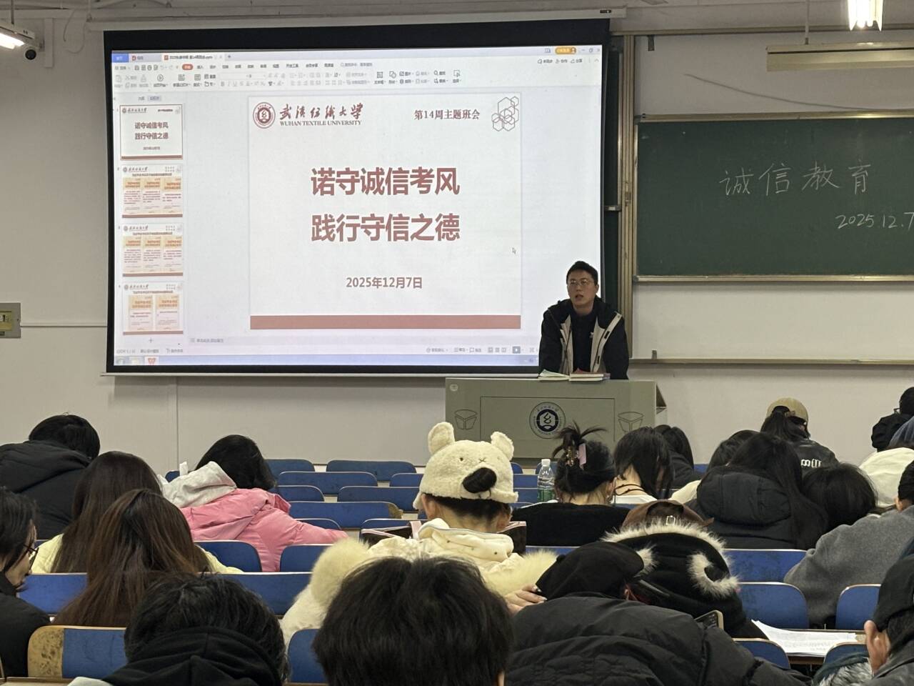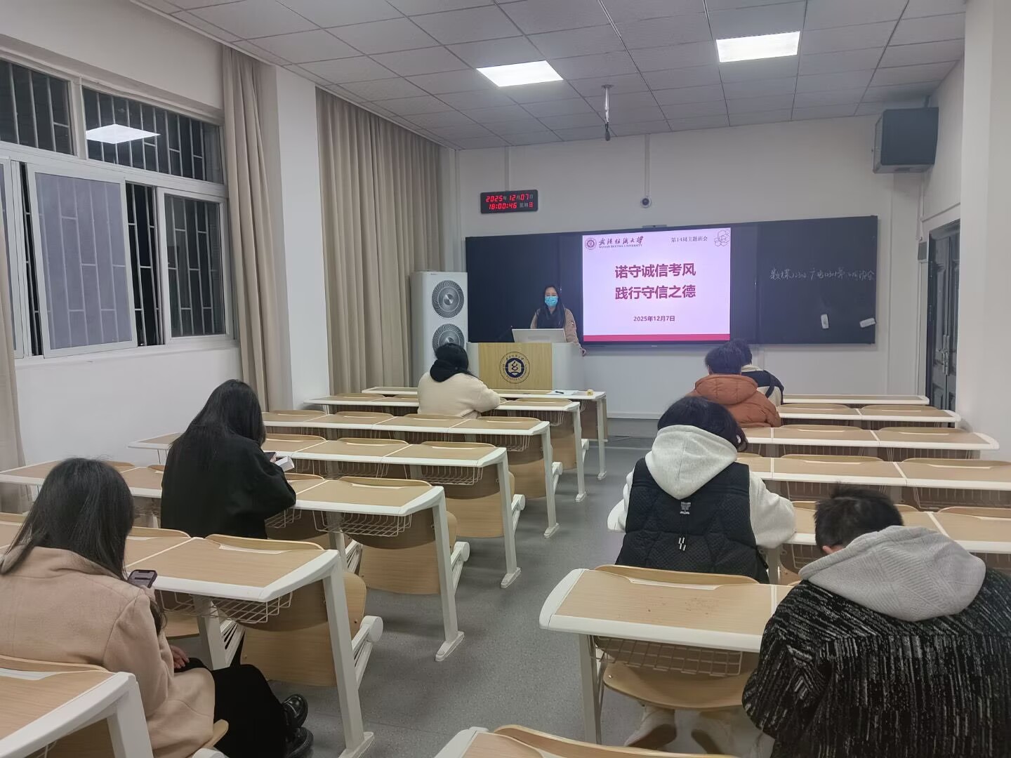 为强化学生诚信应考意识,筑牢学风建设根基,12月7日,武汉纺织大学数学与统计学院组织各班级开展第14周“诺守诚信考风 践行守信之德”主题班会,为即将到来的期末考试保驾护航。全体同学参加,班会有由班长主持。