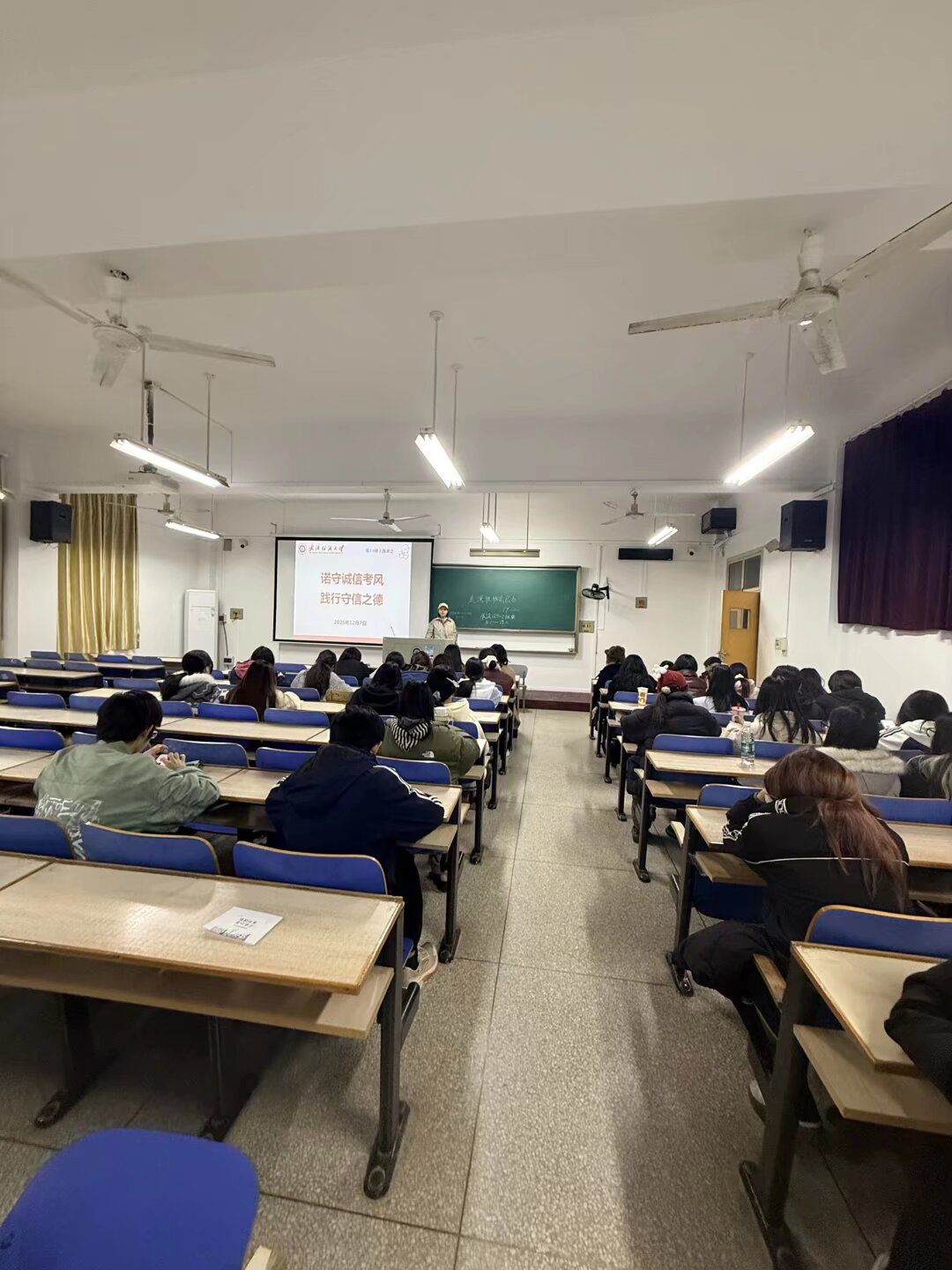 为强化学生诚信应考意识,夯实期末学生管理根基,营造风清气正的备考氛围,12月7日,学院于崇德楼顺利开展 “诺守诚信考风,践行守信之德”主题教育班会。班会由各年级辅导员、班主任主持,全体学生共同参与。
