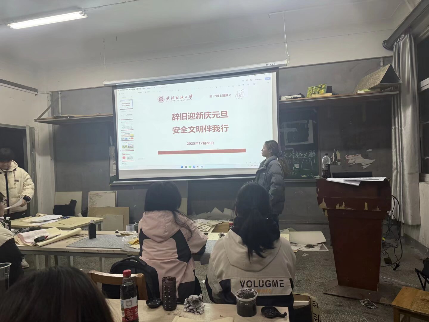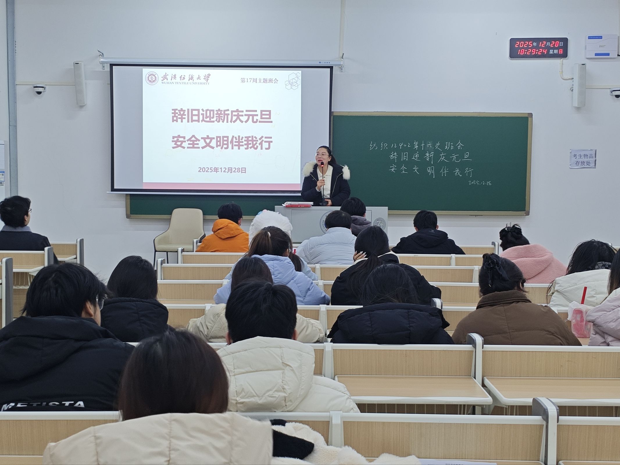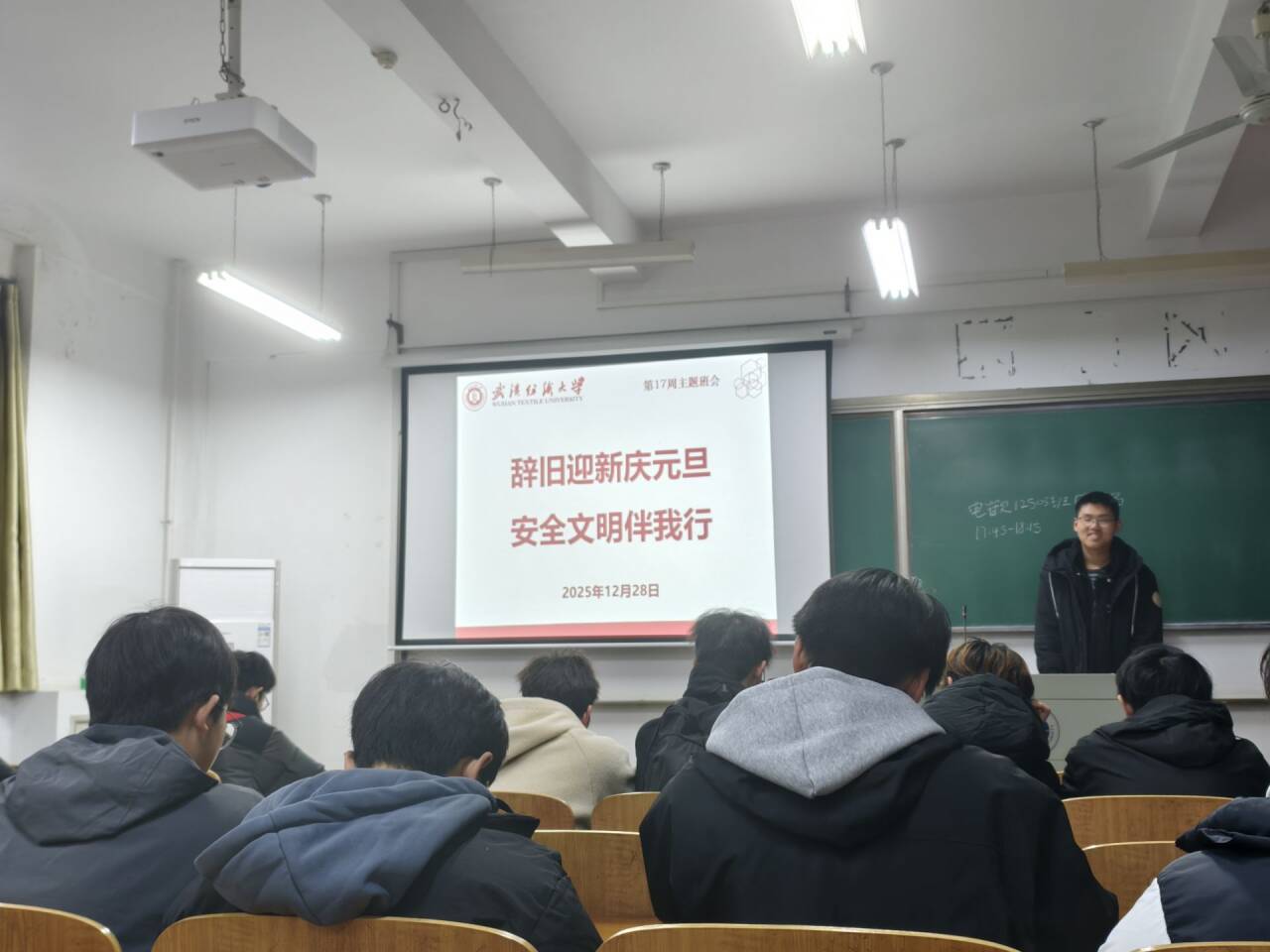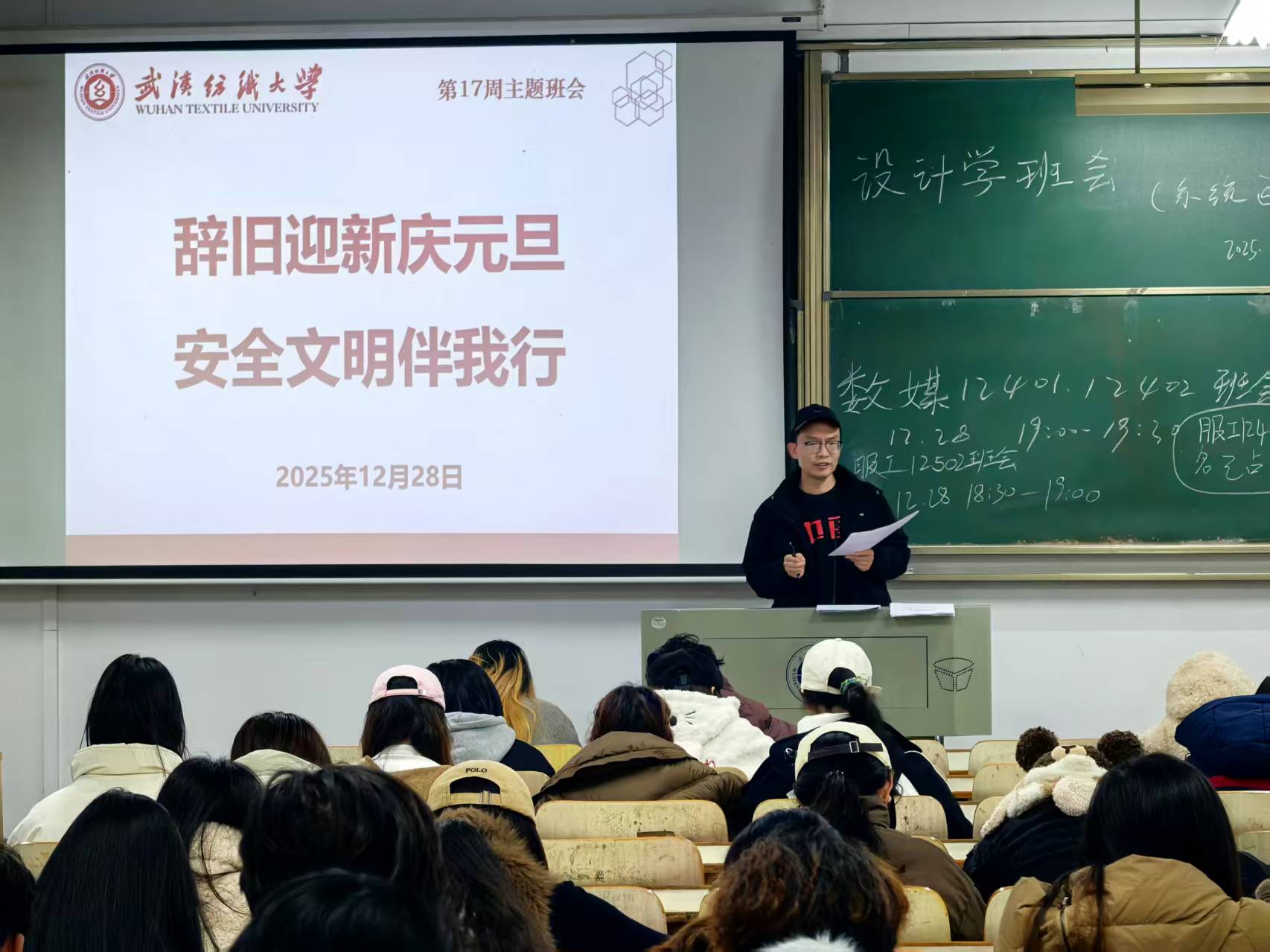 元旦的脚步悄然临近,安全文明的警钟时刻长鸣。12月28日,武汉纺织大学数学与统计学院在崇志楼开展了一场以“辞旧迎新庆元旦,安全文明伴我行”为主题的班会活动。各班班长结合元旦假期特点,为同学们讲解假期安全注意事项与文明行为准则,同学们认真聆听讲解、积极参与互动讨论,在新年将至的氛围中,筑牢安全文明意识防线,为度过平安祥和的元旦假期打下坚实基础。