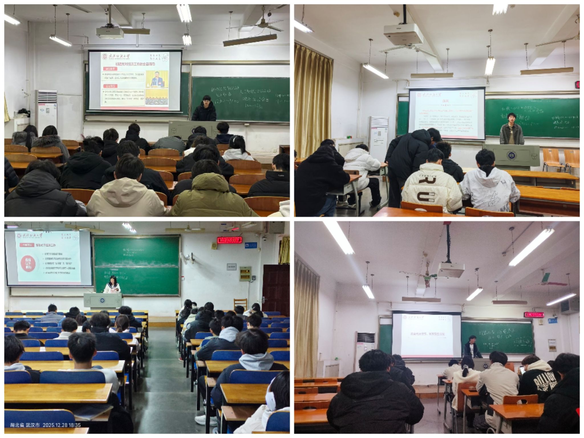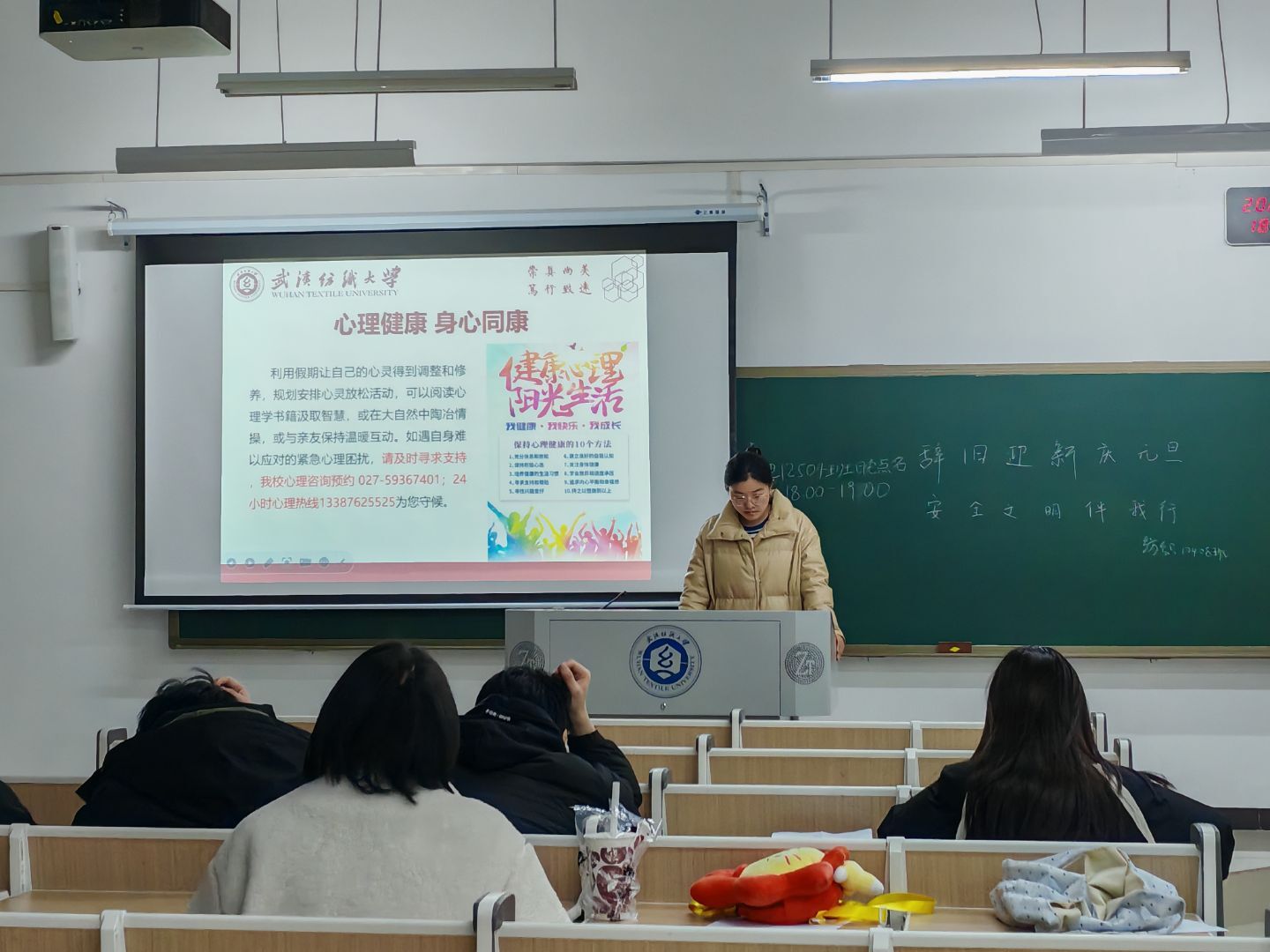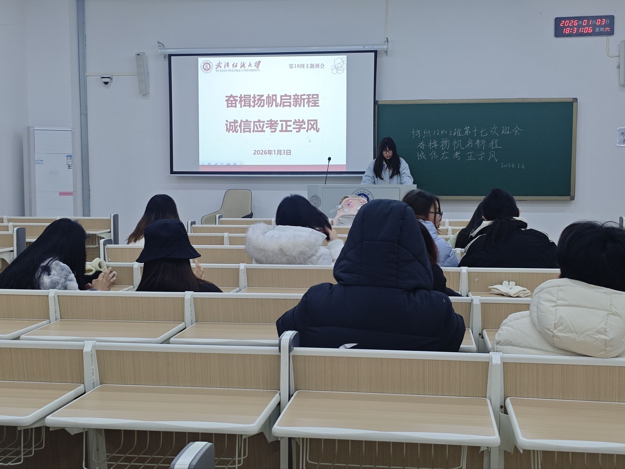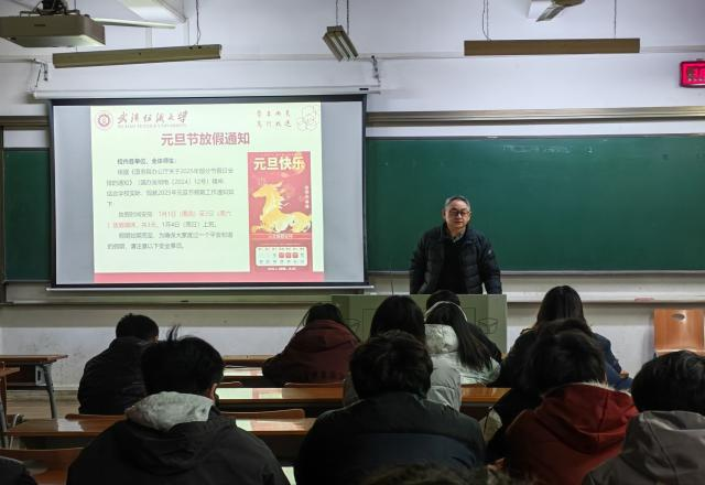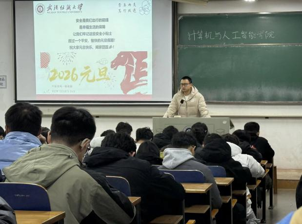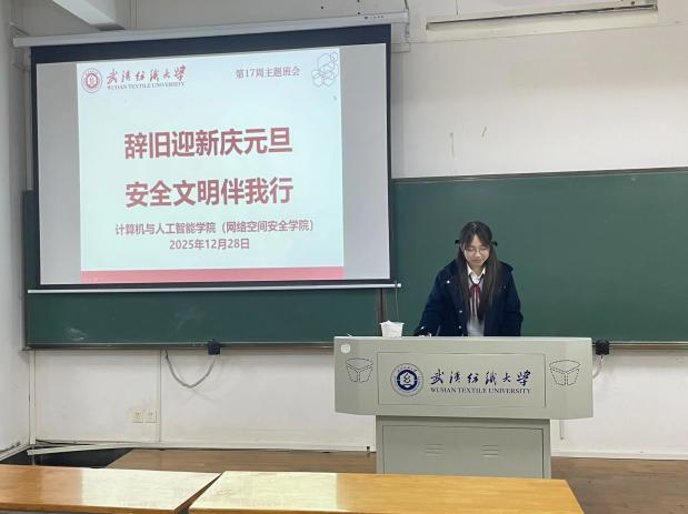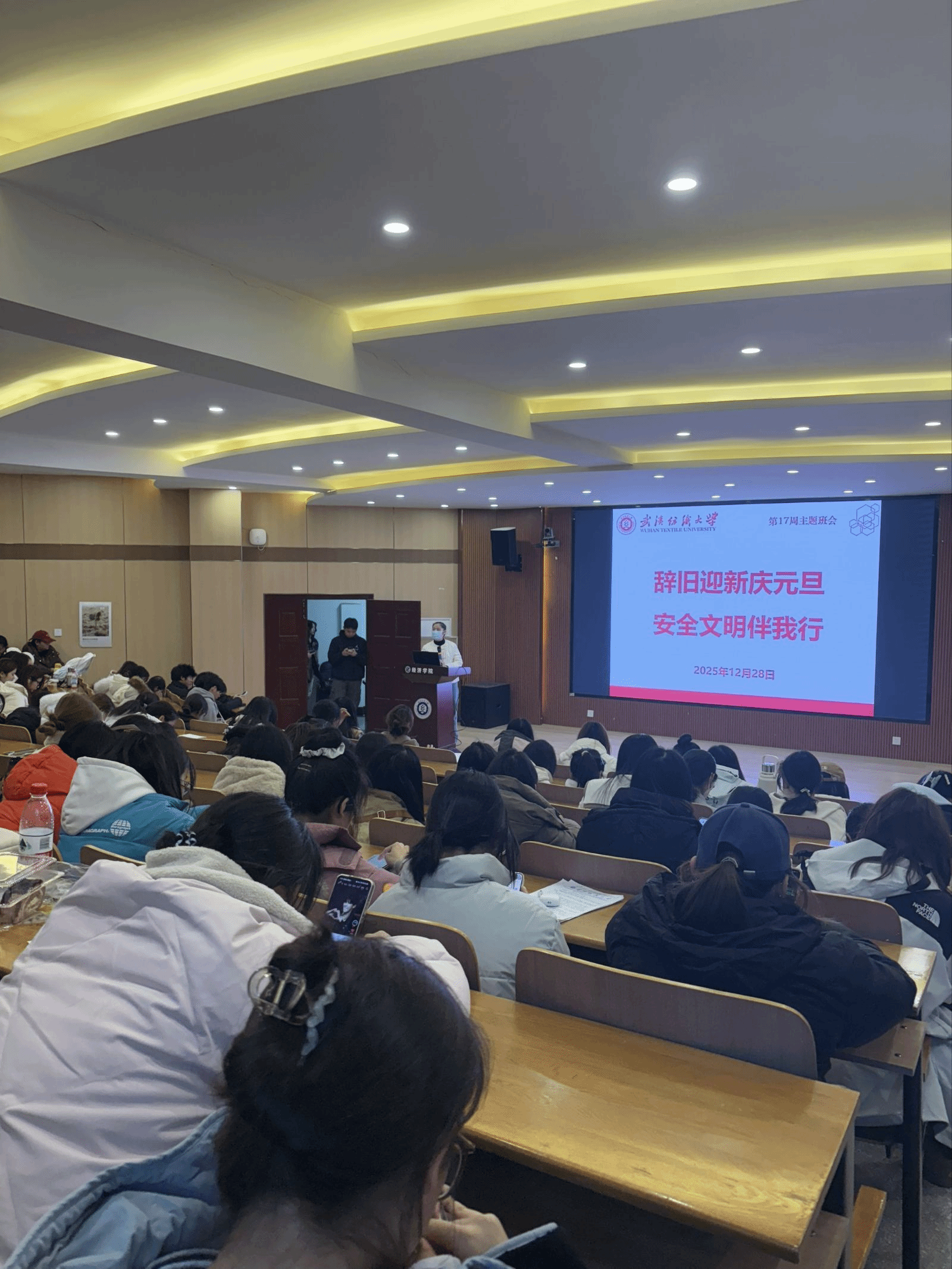 元旦的脚步悄然临近,安全文明的警钟时刻长鸣。12月28日,武汉纺织大学数学与统计学院在崇志楼开展了一场以“辞旧迎新庆元旦,安全文明伴我行”为主题的班会活动。各班班长结合元旦假期特点,为同学们讲解假期安全注意事项与文明行为准则,同学们认真聆听讲解、积极参与互动讨论,在新年将至的氛围中,筑牢安全文明意识防线,为度过平安祥和的元旦假期打下坚实基础。