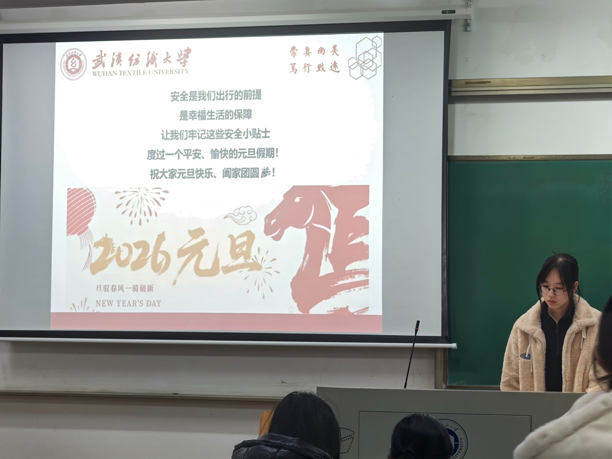 此次主题班会的召开,是纺织学院落实“三全育人”理念的具体实践,既为学生营造了辞旧迎新的温馨氛围,也筑牢了安全文明的思想防线。元旦不仅是辞旧迎新的节点,更是梳理规划、积蓄力量的契机。希望同学们在享受节日氛围的同时,始终把安全放在首位,以文明行为展现纺织学院学子的良好风貌,用充实的状态迎接新一年的学业与成长。
