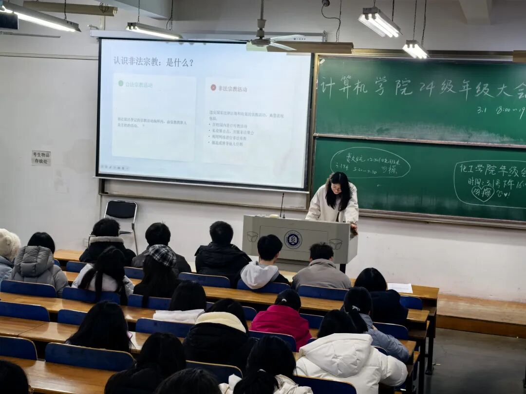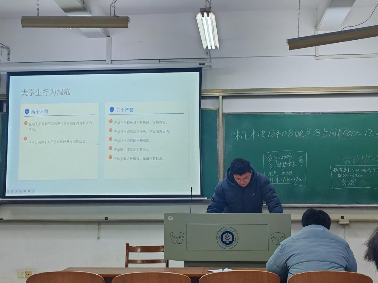 为筑牢校园安全与思想防线,辅导员、班主任通过政策解读、案例分析等方式,向同学们普及宗教政策法规,阐明非法宗教活动的危害与表现形式,引导同学们树立正确的世界观、人生观、价值观,自觉抵制各类非法宗教渗透,维护校园和谐稳定与安全秩序。
