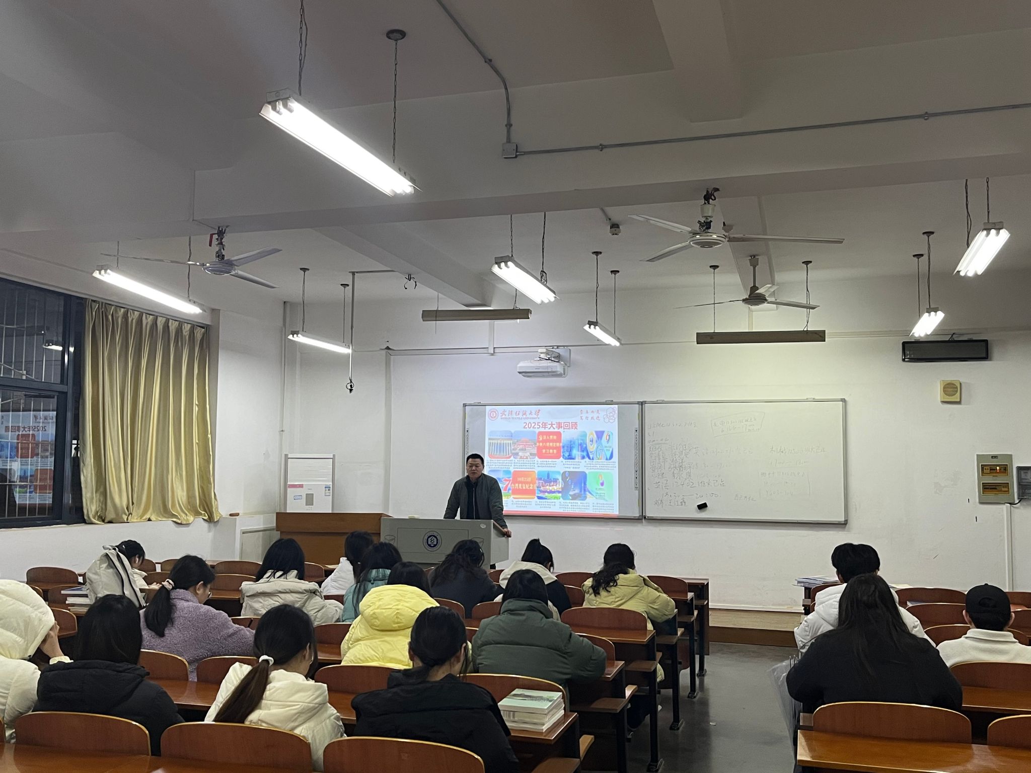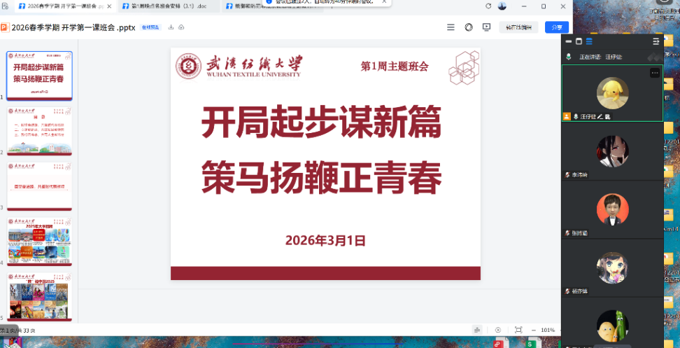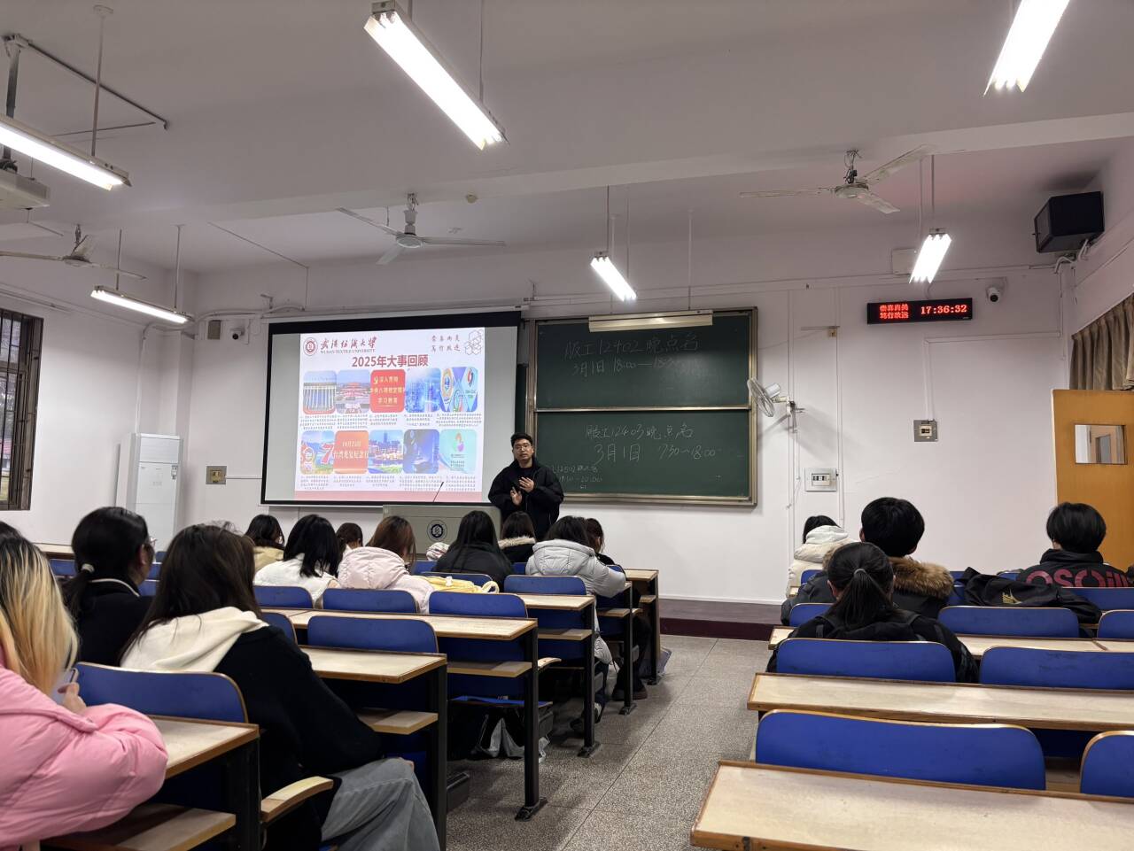 班会伊始,全体辅导员、班主任对所带的年级进行点名,核查学生报到情况,落实并上报未报到学生的名单及事由,班主任和辅导员对未到的学生进行逐一联系。随后辅导员老师带领同学们共同回顾2025年国家与学校发展成就。从“数”说中国2025的亮眼数据,到武汉纺织大学十大新闻的精彩瞬间,同学们深刻感受到国家发展的磅礴力量与学校建设的坚实步伐。同时,通过“守护青春,远离渗透”专题教育,明确了非法宗教活动的边界与危害,强化了校园安全意识,筑牢了思想防线。