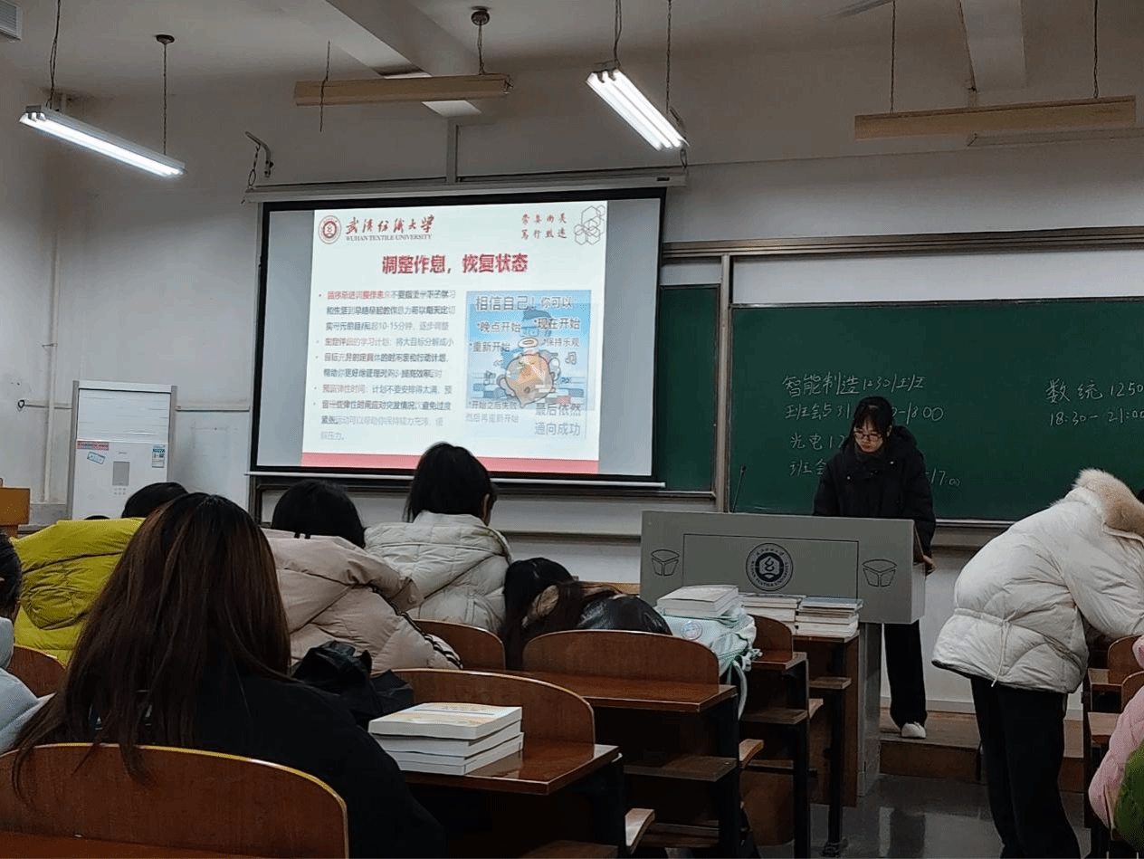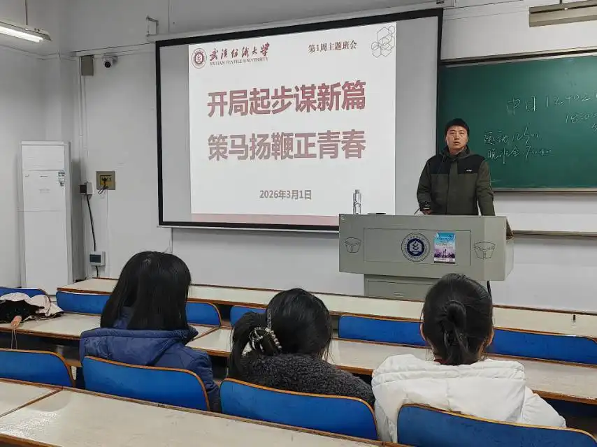老师带领同学们一同回望了2025年国家发展的辉煌成就,从党的二十届四中全会擘画发展蓝图、抗战胜利80周年纪念大会隆重举行,到天问二号逐梦深空、福建舰正式入列,再到经济社会发展目标圆满完成、高水平对外开放持续推进,一个个重大事件、一组组亮眼数据,让同学们深切感受到国家发展的强劲脉搏。同时,大家共同学习了武汉纺织大学2025年十大新闻,了解到学校在学科建设、科研创新、人才培养等方面取得的突破性进展,进一步增强了作为纺大学子的归属感与自豪感。立足“十五五”开局之年的新起点,老师向同学们解读了2026年国家重要发展节点与学校发展新愿景,介绍了学校在一流学科建设、人才培养、校园建设等方面的十大发力方向,鼓励同学们将个人发展与学校、国家的发展同频共振,锚定目标、脚踏实地,在新学期追求新进步、实现新突破。针对开学后同学们可能出现的作息紊乱、开学焦虑等问题,老师从接纳情绪、调整作息、制订计划等方面给出具体建议,分享了正念呼吸、规律运动等情绪调节方法,并公布了校内外心理求助途径,为同学们的心理健康保驾护航。此外,班会还介绍了2026年各类重要考试时间节点,提醒同学们提前规划、合理安排学习时间,做好学业与考证的统筹规划。