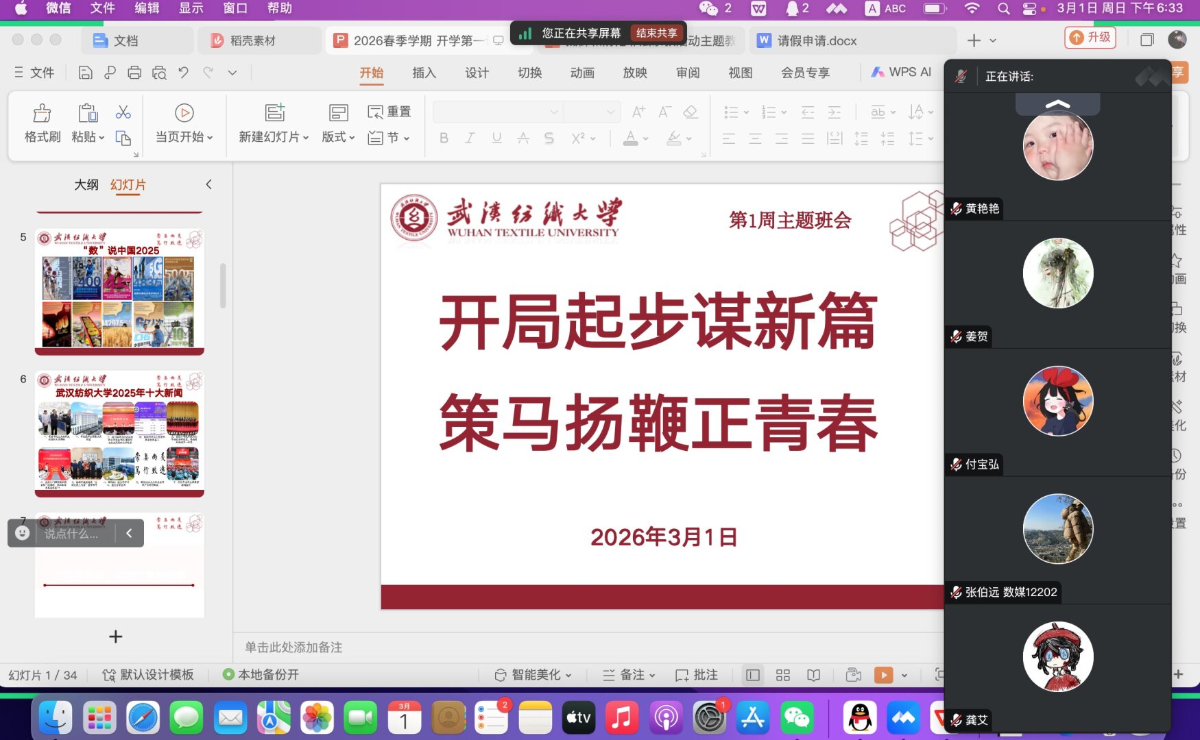 2025级班主任以“开局起步谋新篇 策马扬鞭正青春”为核心主线,带领学生回顾2025年国家发展十大成就与武汉纺织大学十大校园新闻,从国家“十四五”圆满收官、“十五五”规划擘画蓝图,到学校纺织科学与工程学科跃居世界第二、获批全国重点实验室,让学生真切感受国家与学校的发展脉搏,引导学生在“十五五”开局之年锚定成长目标、坚定奋进信心。同时重点开展《新学期“心”适应》开学适应主题教育,针对学生从假期模式切换到校园模式可能出现的作息紊乱、焦虑烦躁等问题,从接纳情绪、调整作息、制定计划三个维度给出具体指导,分享正念呼吸、规律运动等情绪调节方法,告知校内校外心理专业求助途径,帮助学生做好身心双重调整,快速找回校园学习生活节奏。