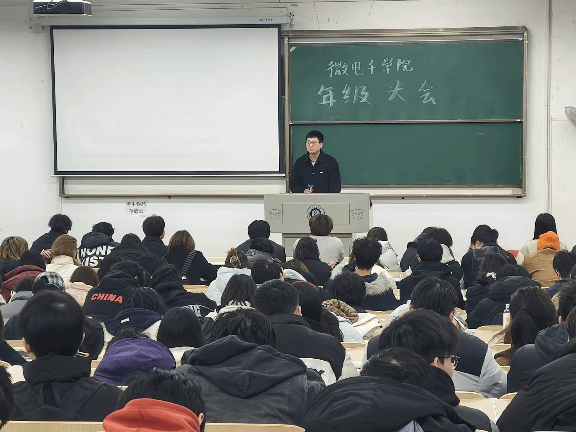 2024级班主任采用“思政铸魂+院长引领”模式,深入开展微电子学院学风建设主题班会,从“思政引领强信念”到“学业规划促行动”,逐一明确学风建设的核心目标,尤其强调专业认知深化、不良学习习惯纠正的关键要求。针对大二“专业认知深化期、学业规划关键期、升学就业定向期”三期叠加的核心学情,详细讲解两大专业学习与发展要点:厘清微电子科学与工程、光电信息科学与工程的专业定位及核心差异,杜绝专业认知模糊、学习目标不明、上课走神、作业拖延等不良现象。此外,围绕“学风养成与学业发展”分享实操路径,指导学生以“勤学、善思、笃行、严谨、求真”树立优良学风,用“明确阶段目标、制定行动方案”规划学业发展,助力学生筑牢大二学风根基、科学规划专业成长。
