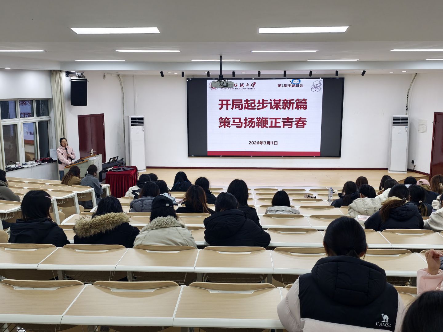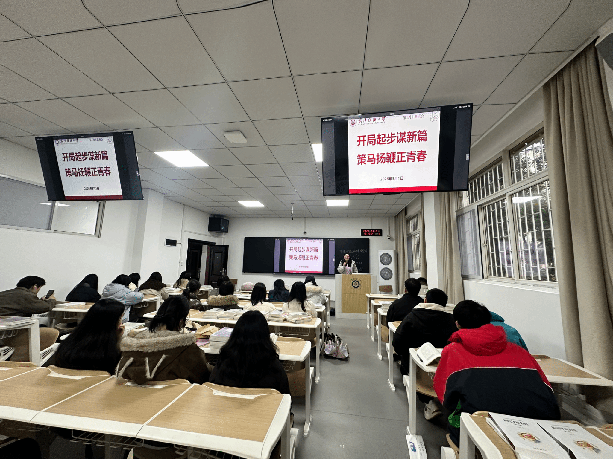 2026年3月1日晚,学院分年级开展开展春季学期第一周晚点名主题班会。本次班会以“开局起步谋新篇,策马扬鞭正青春”为核心,围绕“回望奋进路、立足新起点、践行青春志”三大篇章,引导全体学生收心归位、明确目标,以昂扬姿态开启新学期征程。
