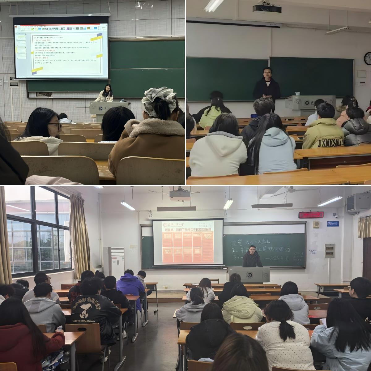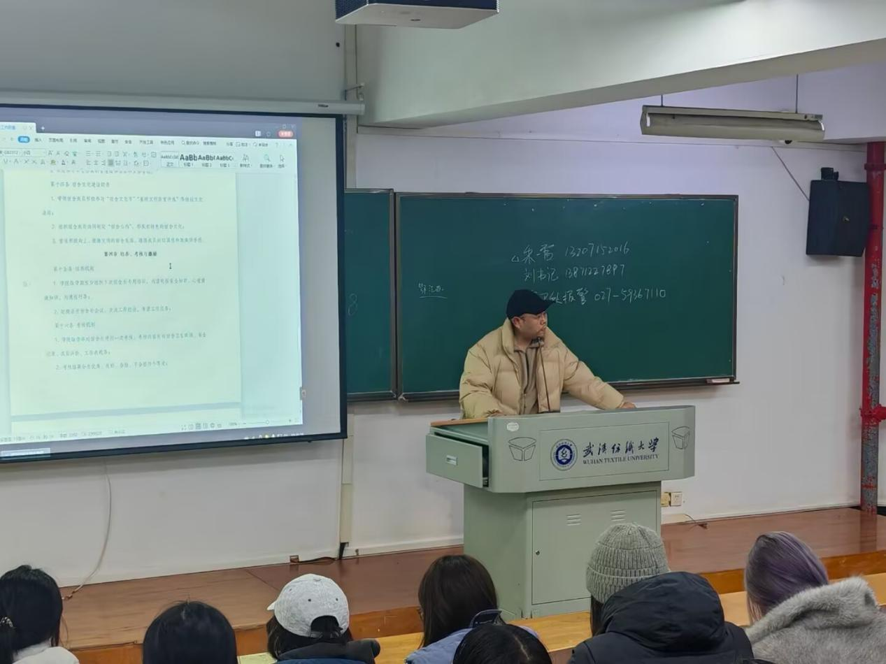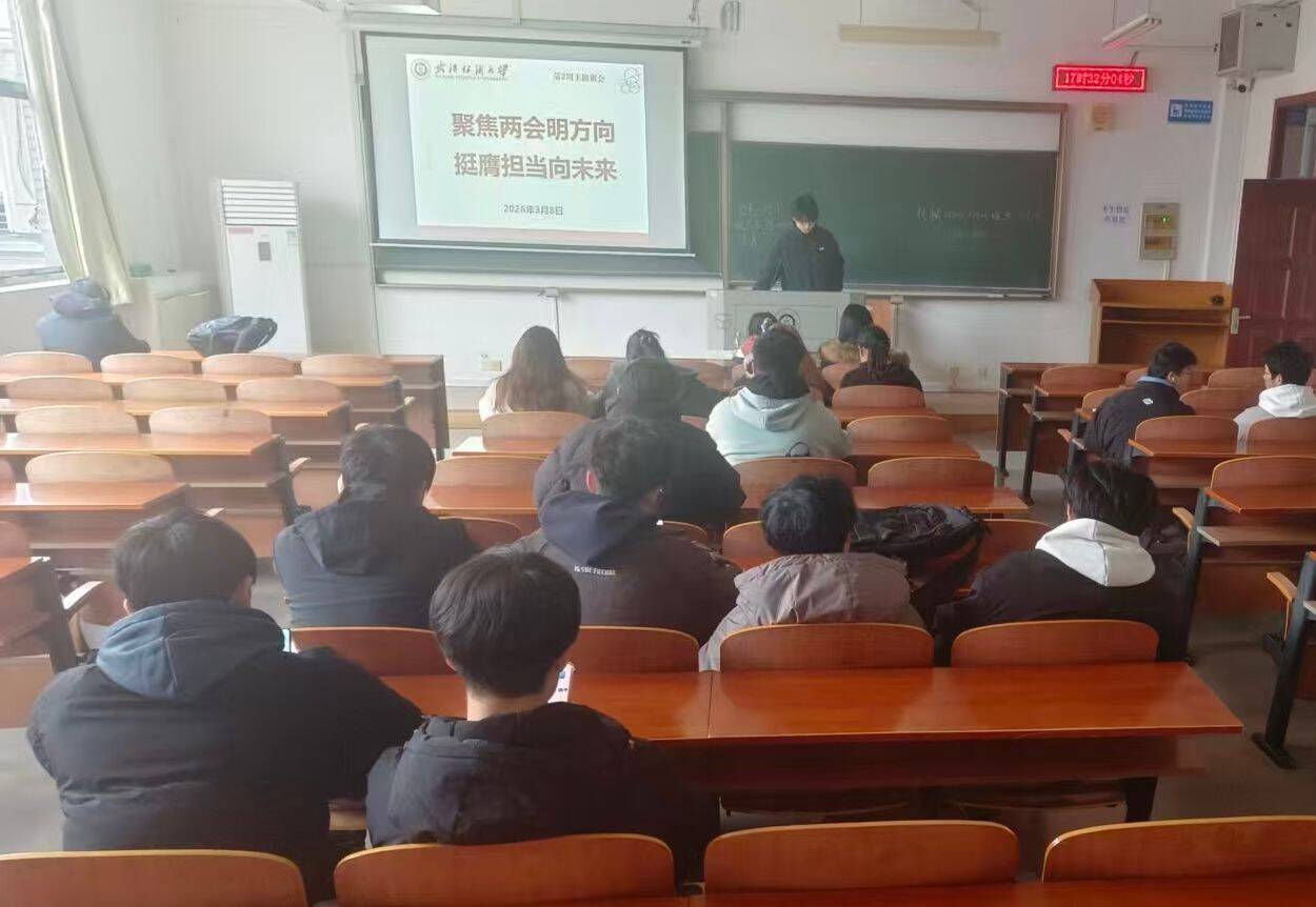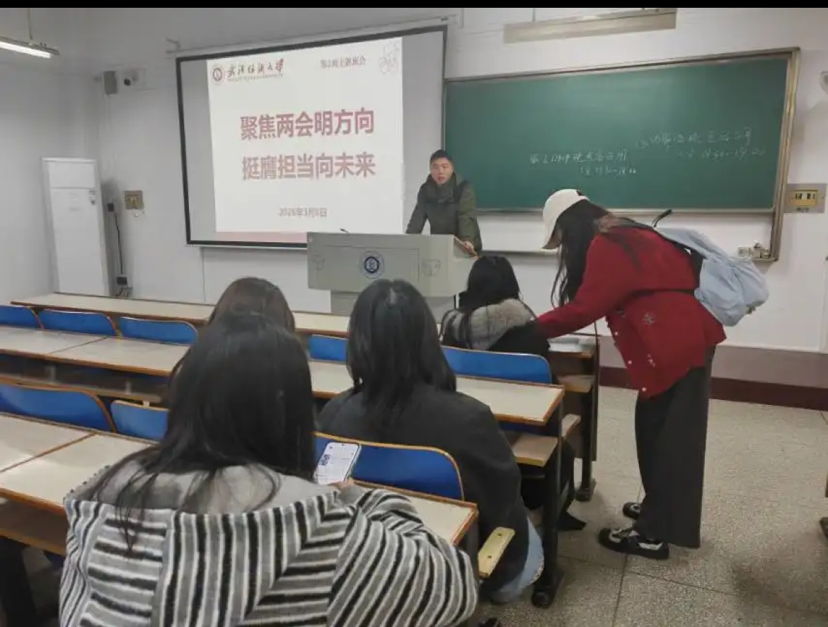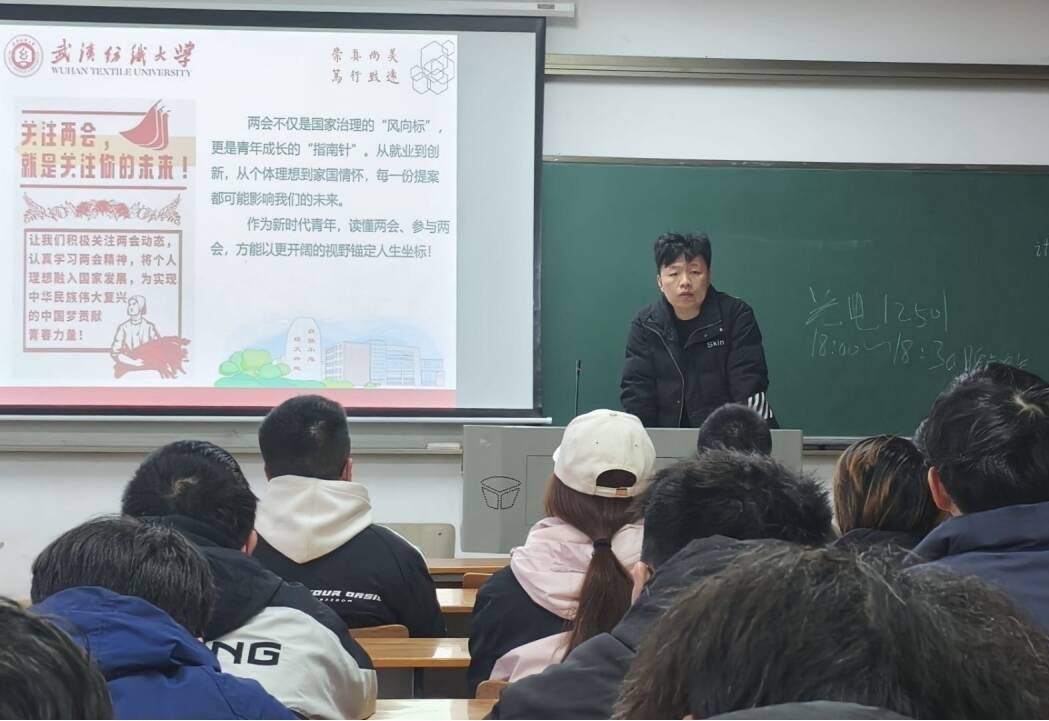 会上,各班班主任组织同学们深入学习2026年全国两会精神,聚焦五大“关键词”解读今年两会热点,带领大家回顾2025年我国经济社会发展成就,展望2026年国家发展的主要预期目标和政策方向。通过学习,同学们进一步理解了“中国式现代化”的深刻内涵,增强了投身强国建设、民族复兴伟业的责任感与使命感。随后,班主任结合武汉纺织大学“双一流”建设攻坚之年的战略部署,号召全体同学以主人翁姿态积极参与学校发展进程,将个人成长融入学校和国家发展大局。