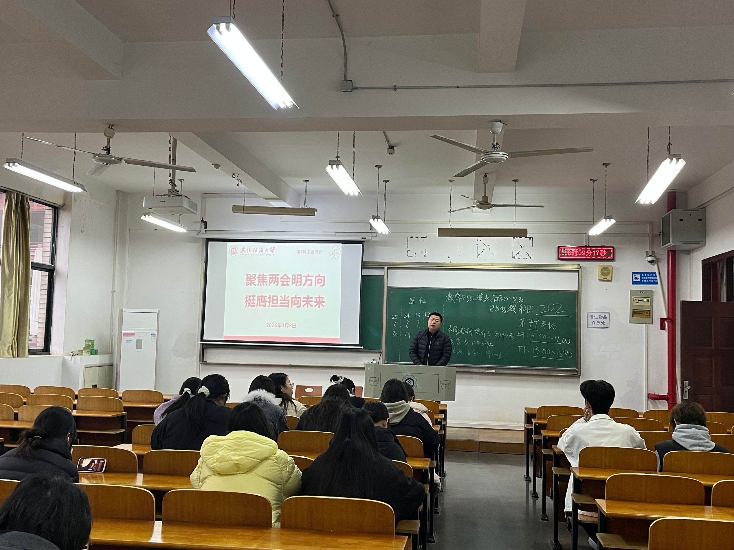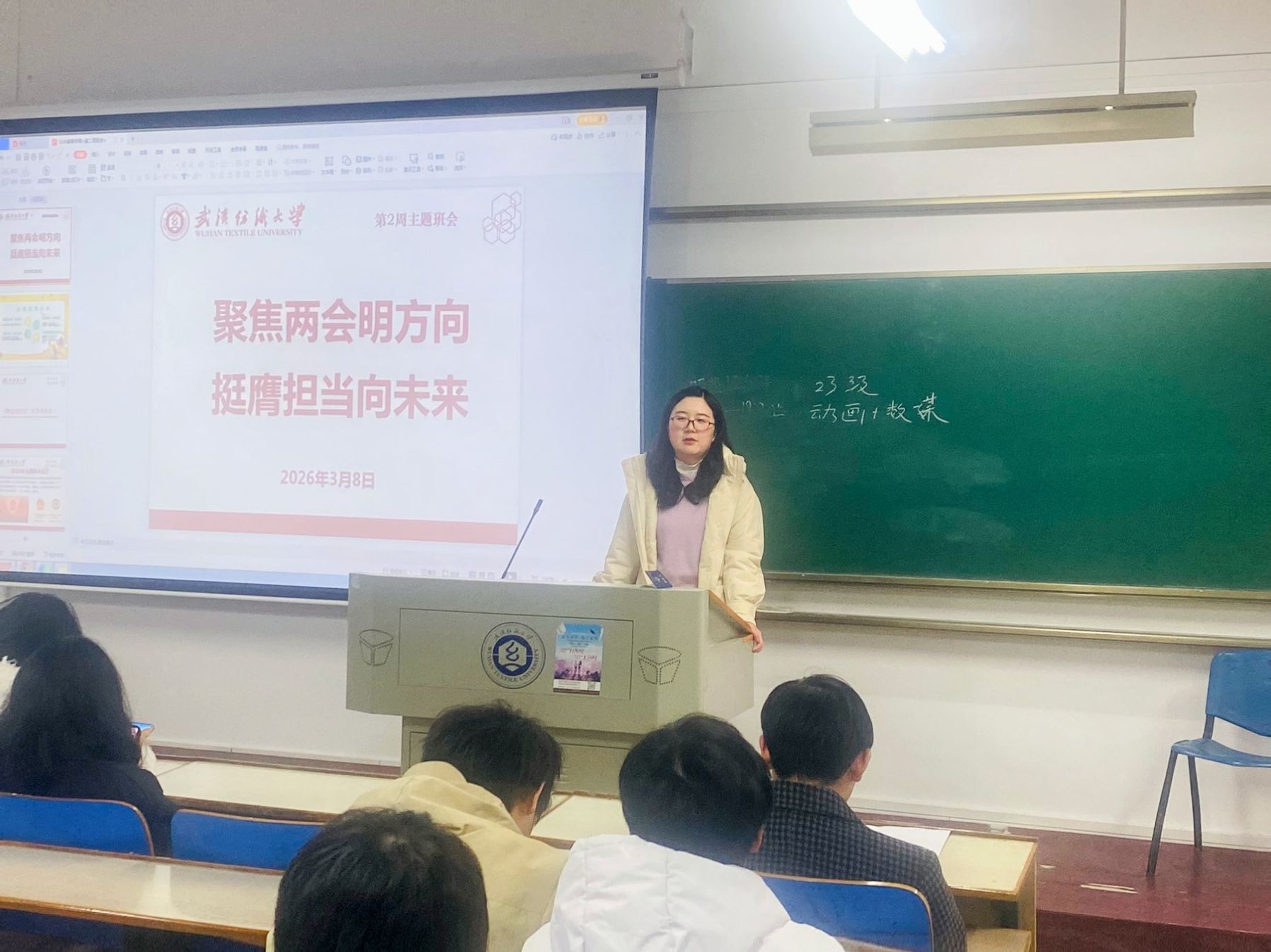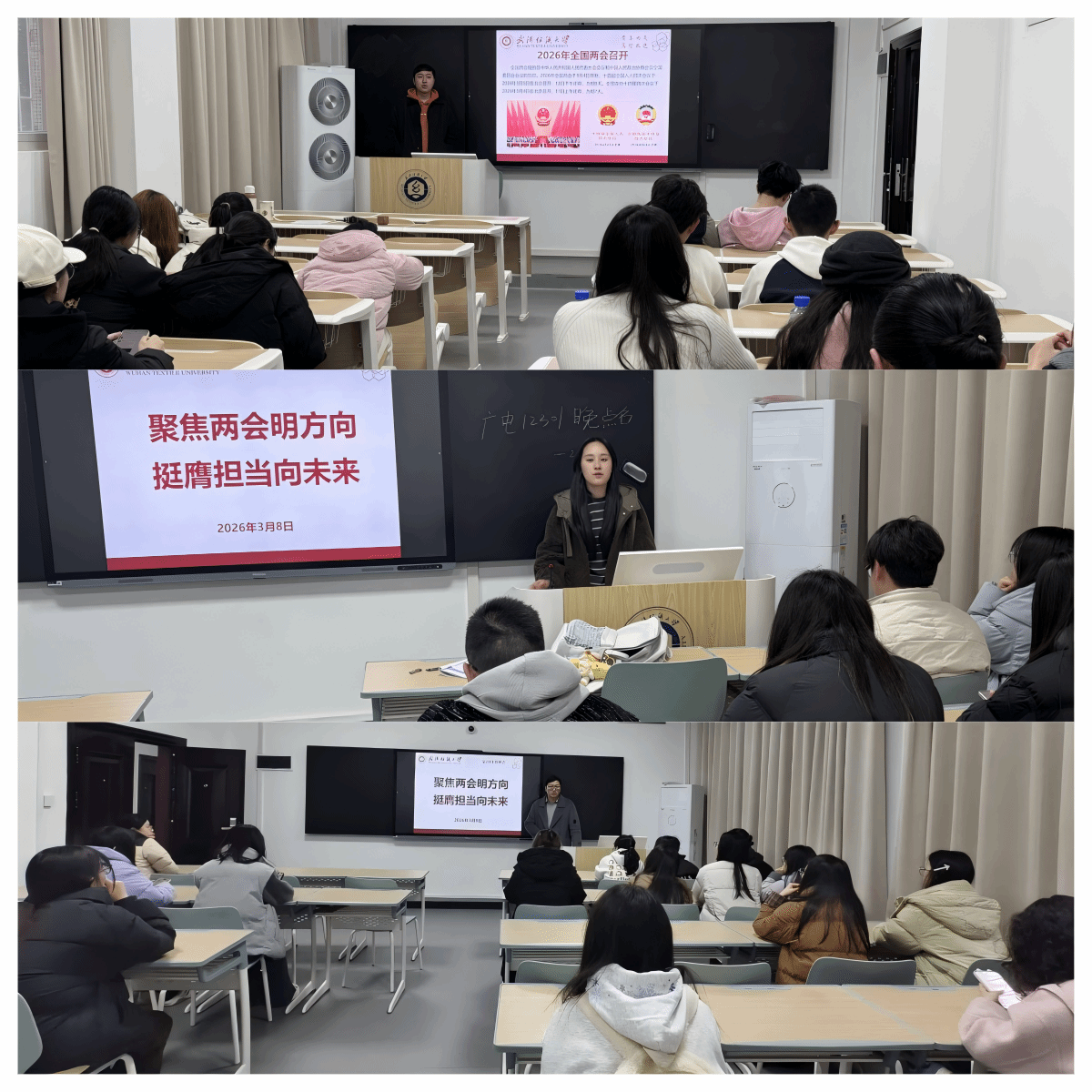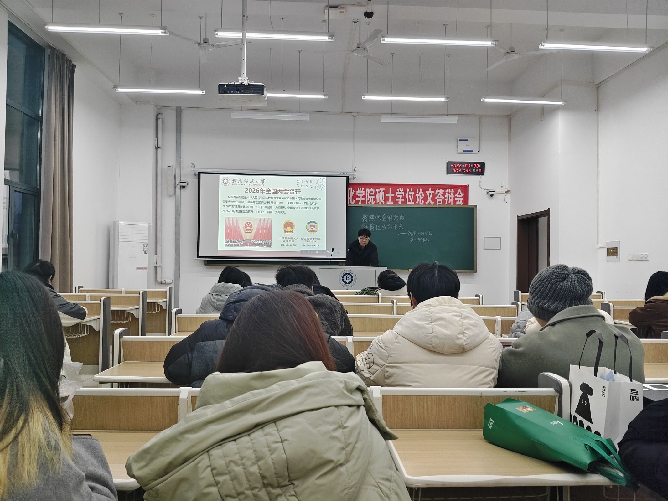 会上,各班班主任组织同学们深入学习2026年全国两会精神,聚焦五大“关键词”解读今年两会热点,带领大家回顾2025年我国经济社会发展成就,展望2026年国家发展的主要预期目标和政策方向。通过学习,同学们进一步理解了“中国式现代化”的深刻内涵,增强了投身强国建设、民族复兴伟业的责任感与使命感。随后,班主任结合武汉纺织大学“双一流”建设攻坚之年的战略部署,号召全体同学以主人翁姿态积极参与学校发展进程,将个人成长融入学校和国家发展大局。
