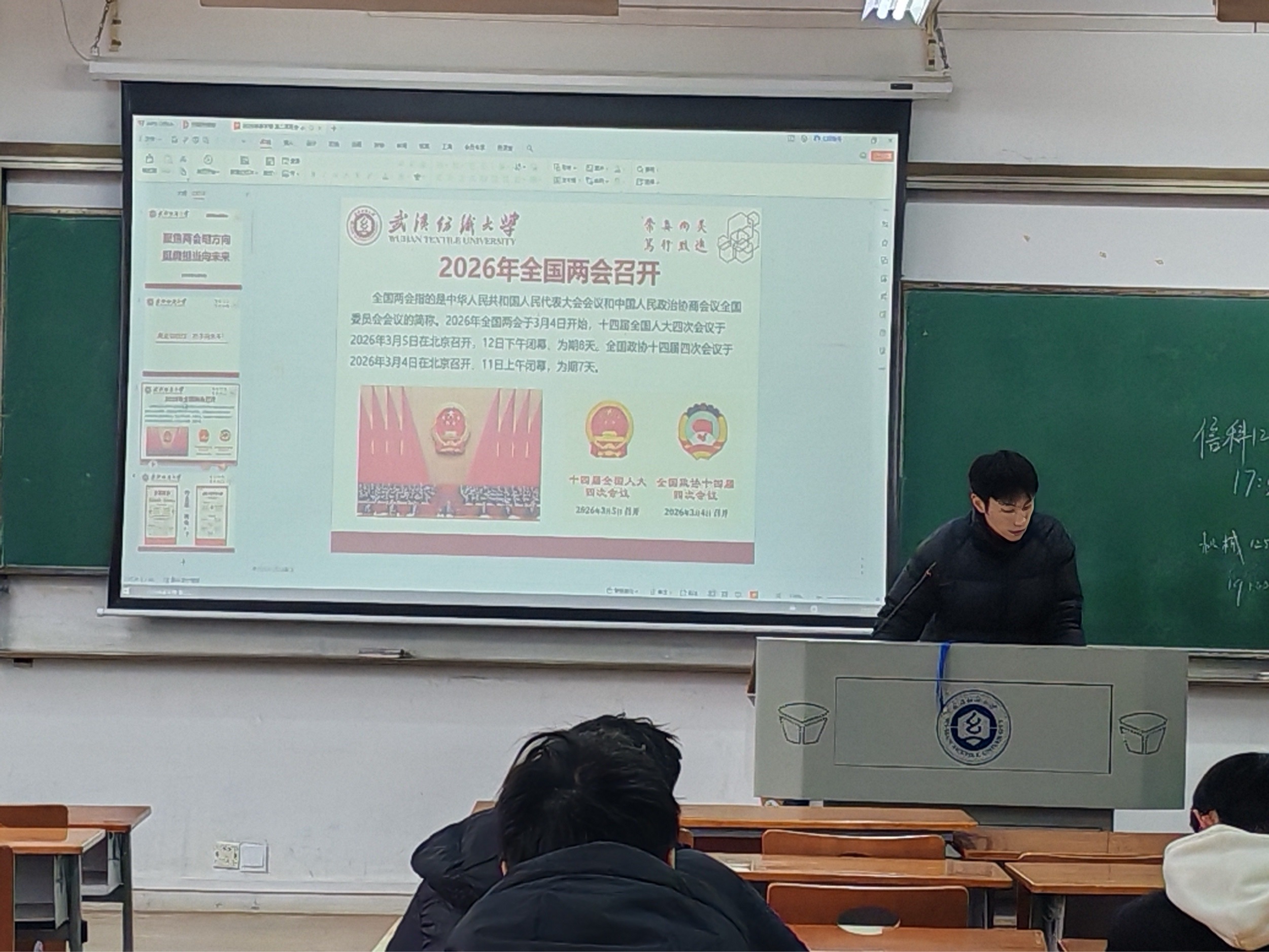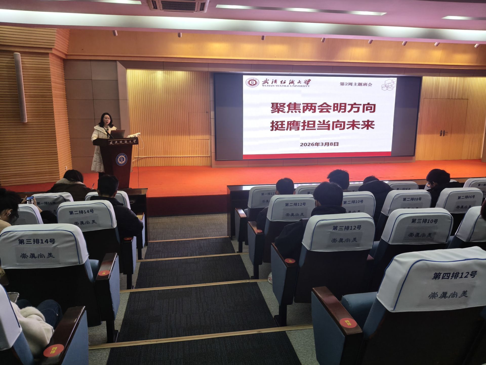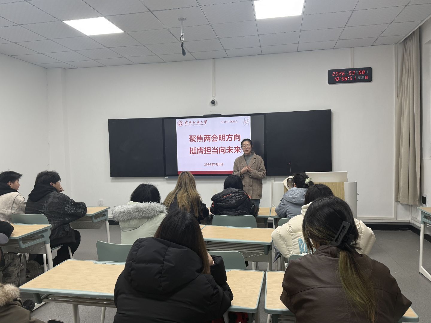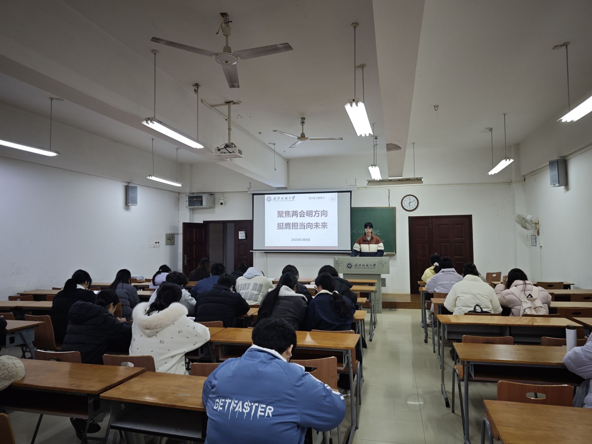 会上,各班班主任组织同学们深入学习2026年全国两会精神,聚焦五大“关键词”解读今年两会热点,带领大家回顾2025年我国经济社会发展成就,展望2026年国家发展的主要预期目标和政策方向。通过学习,同学们进一步理解了“中国式现代化”的深刻内涵,增强了投身强国建设、民族复兴伟业的责任感与使命感。随后,班主任结合武汉纺织大学“双一流”建设攻坚之年的战略部署,号召全体同学以主人翁姿态积极参与学校发展进程,将个人成长融入学校和国家发展大局。