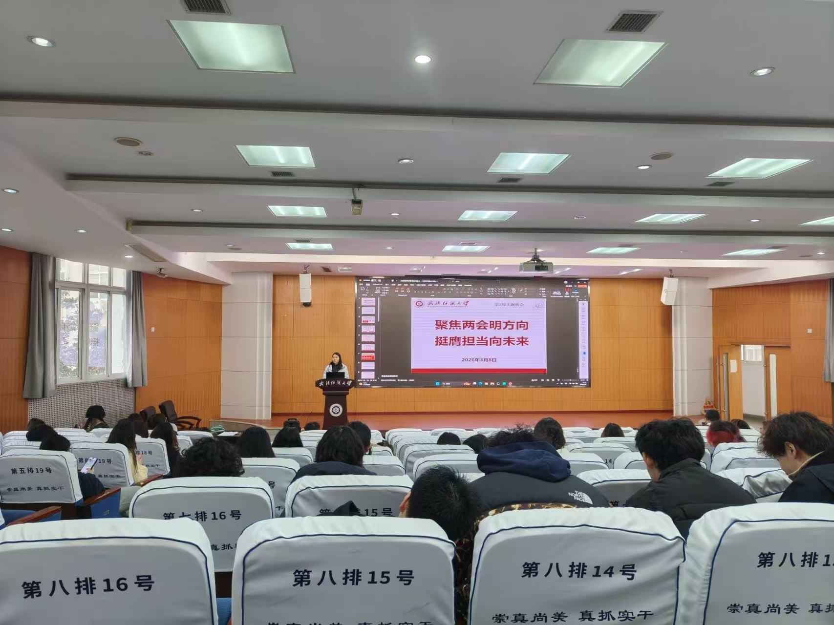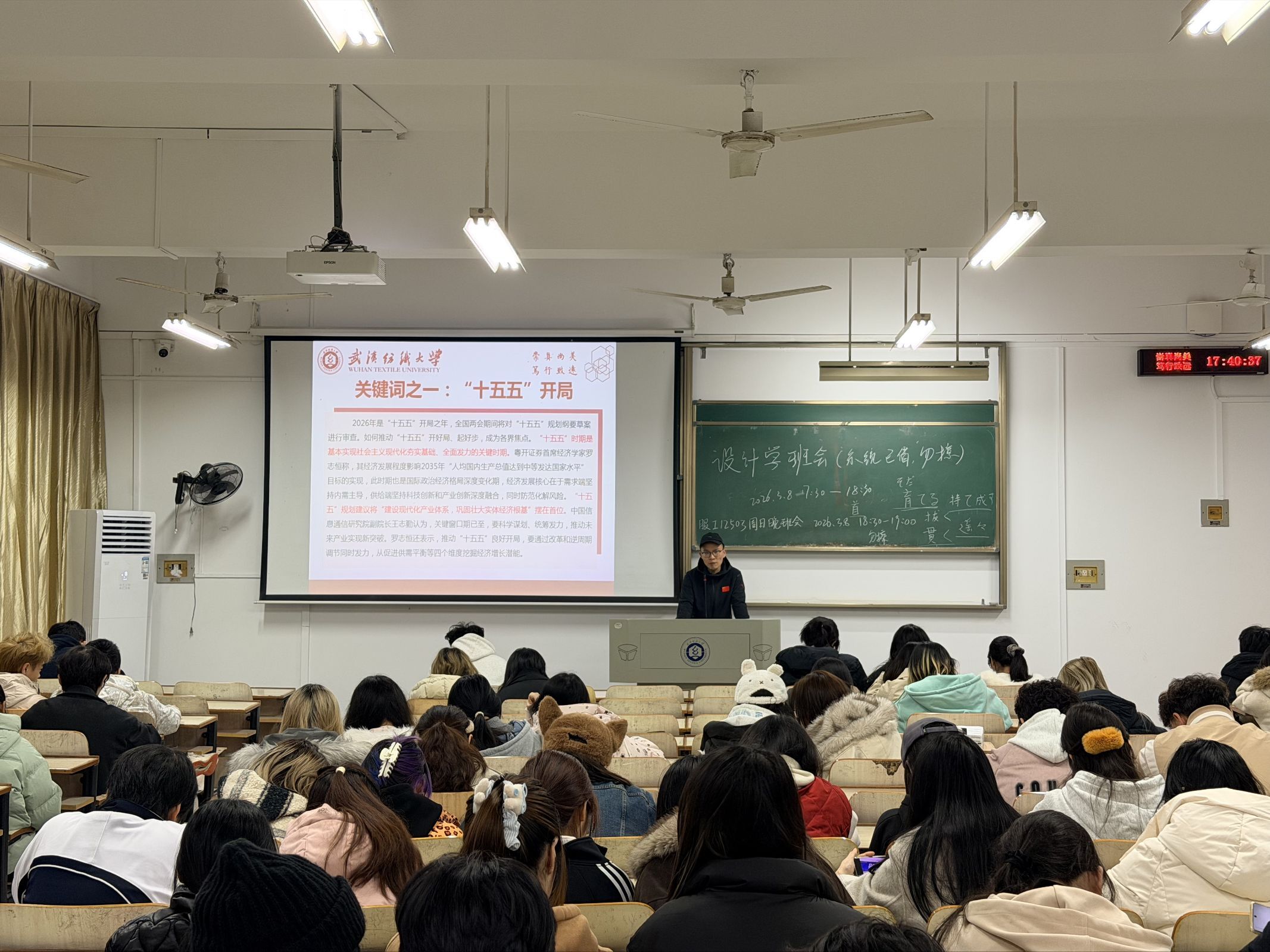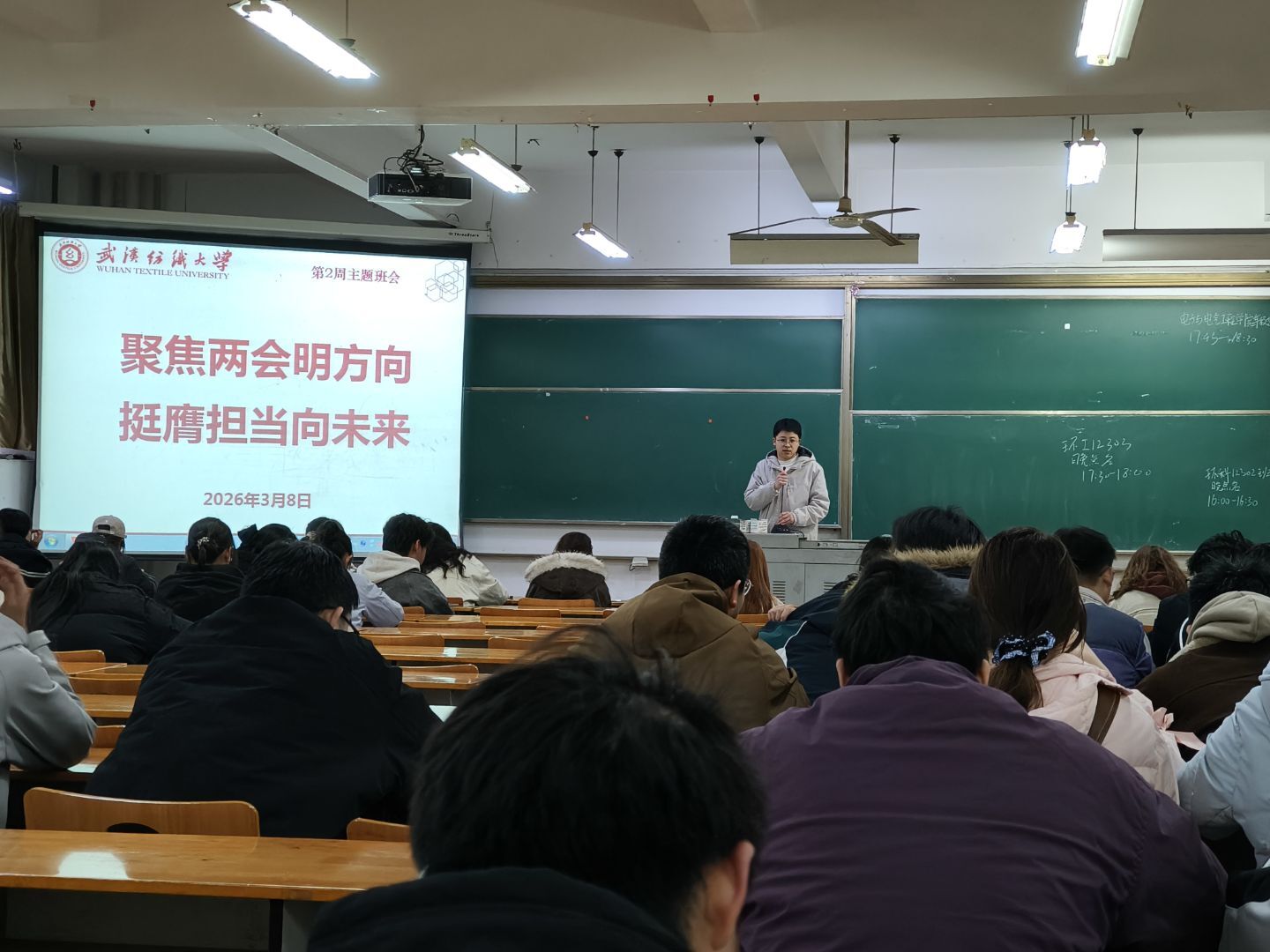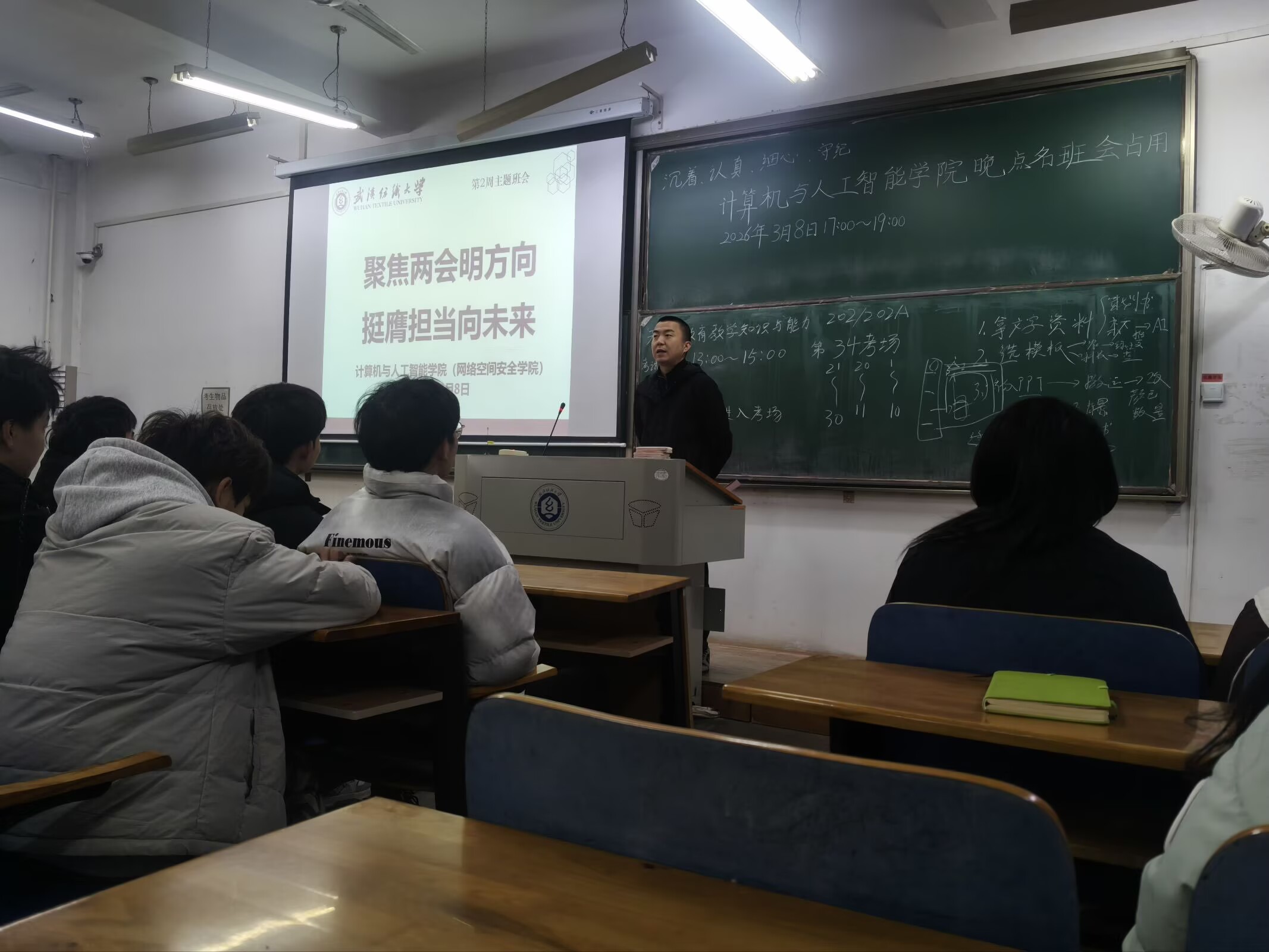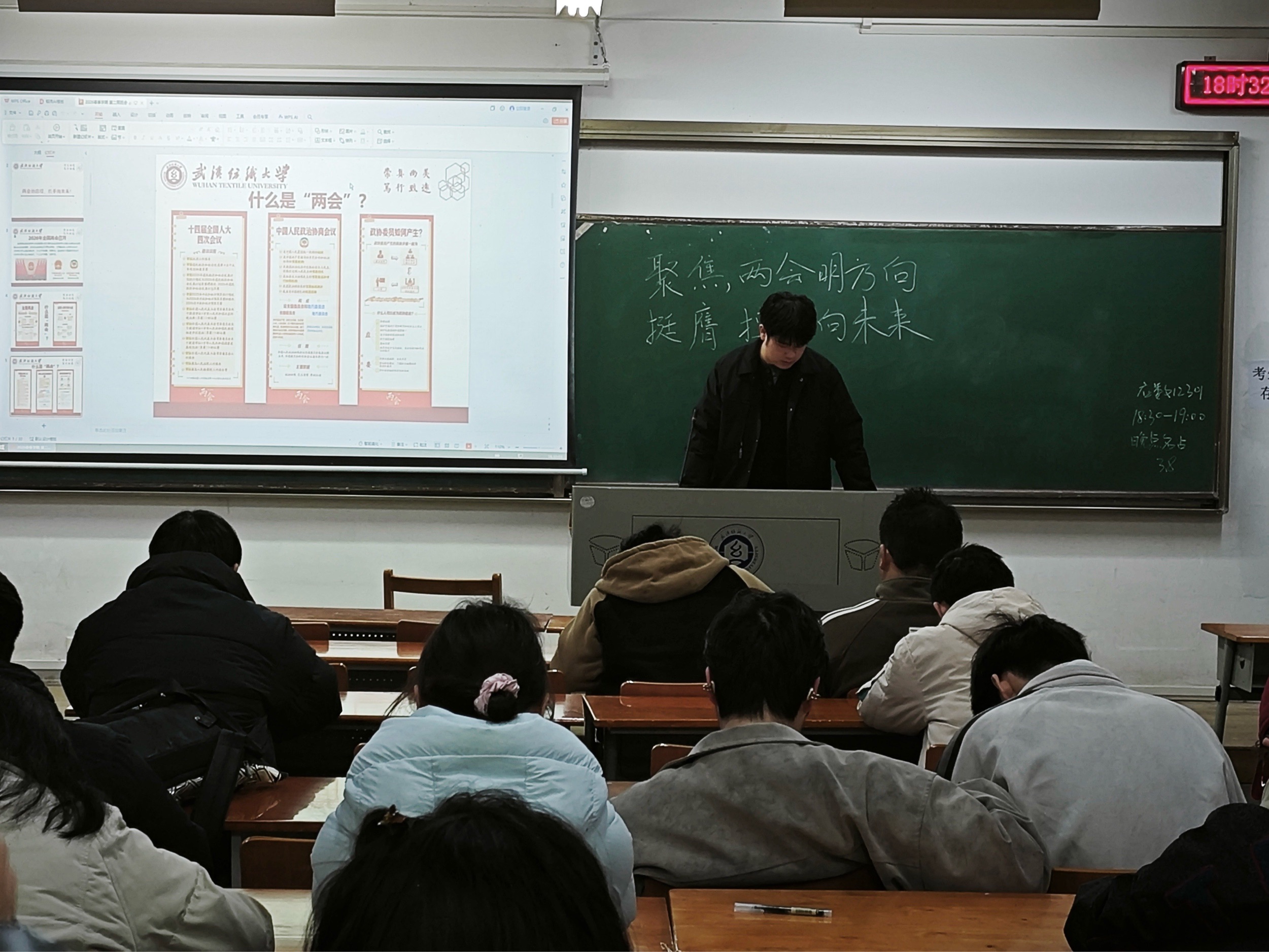会上,各班班主任组织同学们深入学习2026年全国两会精神,聚焦五大“关键词”解读今年两会热点,带领大家回顾2025年我国经济社会发展成就,展望2026年国家发展的主要预期目标和政策方向。通过学习,同学们进一步理解了“中国式现代化”的深刻内涵,增强了投身强国建设、民族复兴伟业的责任感与使命感。随后,班主任结合武汉纺织大学“双一流”建设攻坚之年的战略部署,号召全体同学以主人翁姿态积极参与学校发展进程,将个人成长融入学校和国家发展大局。