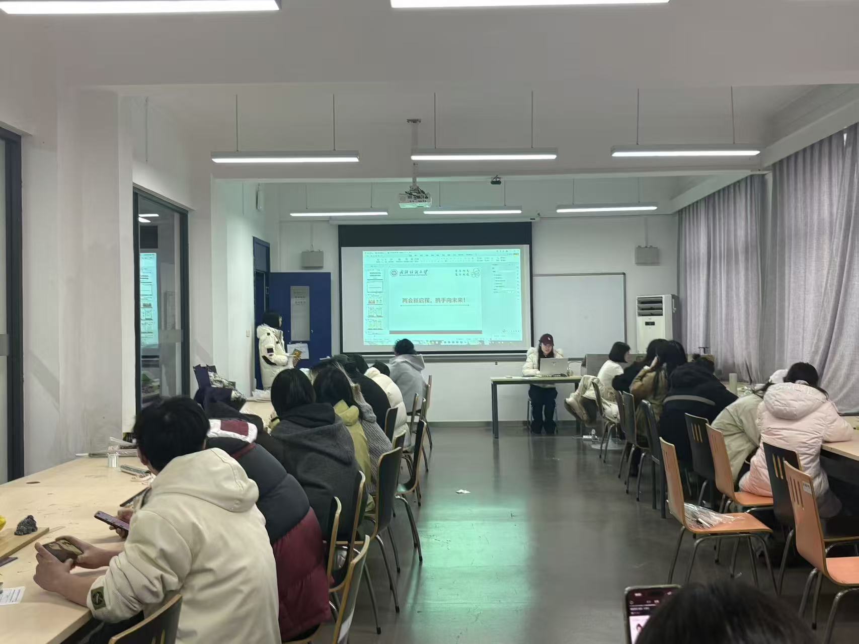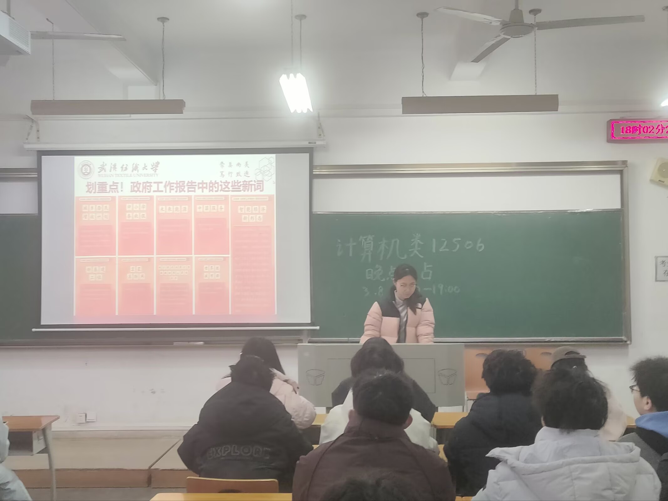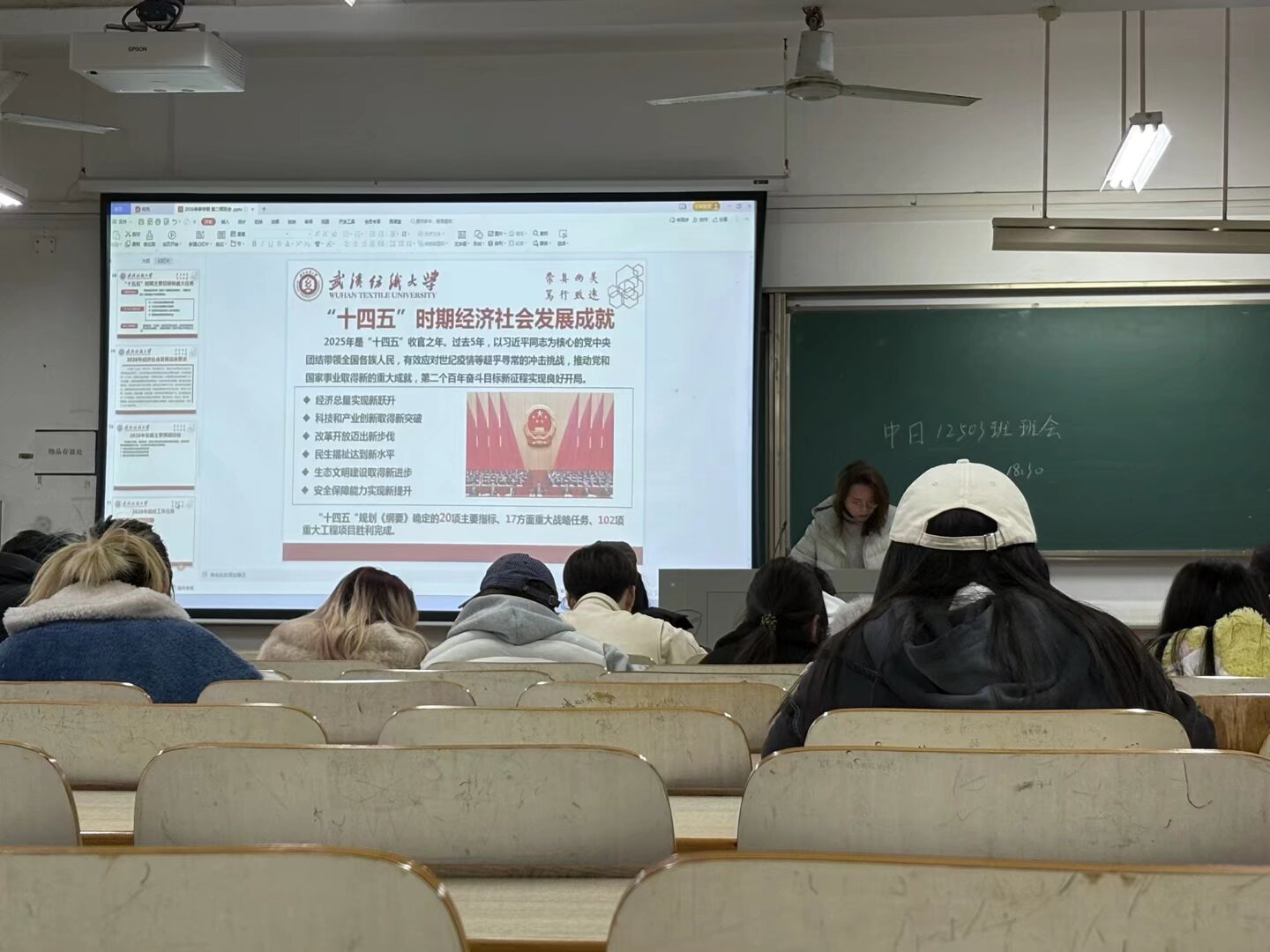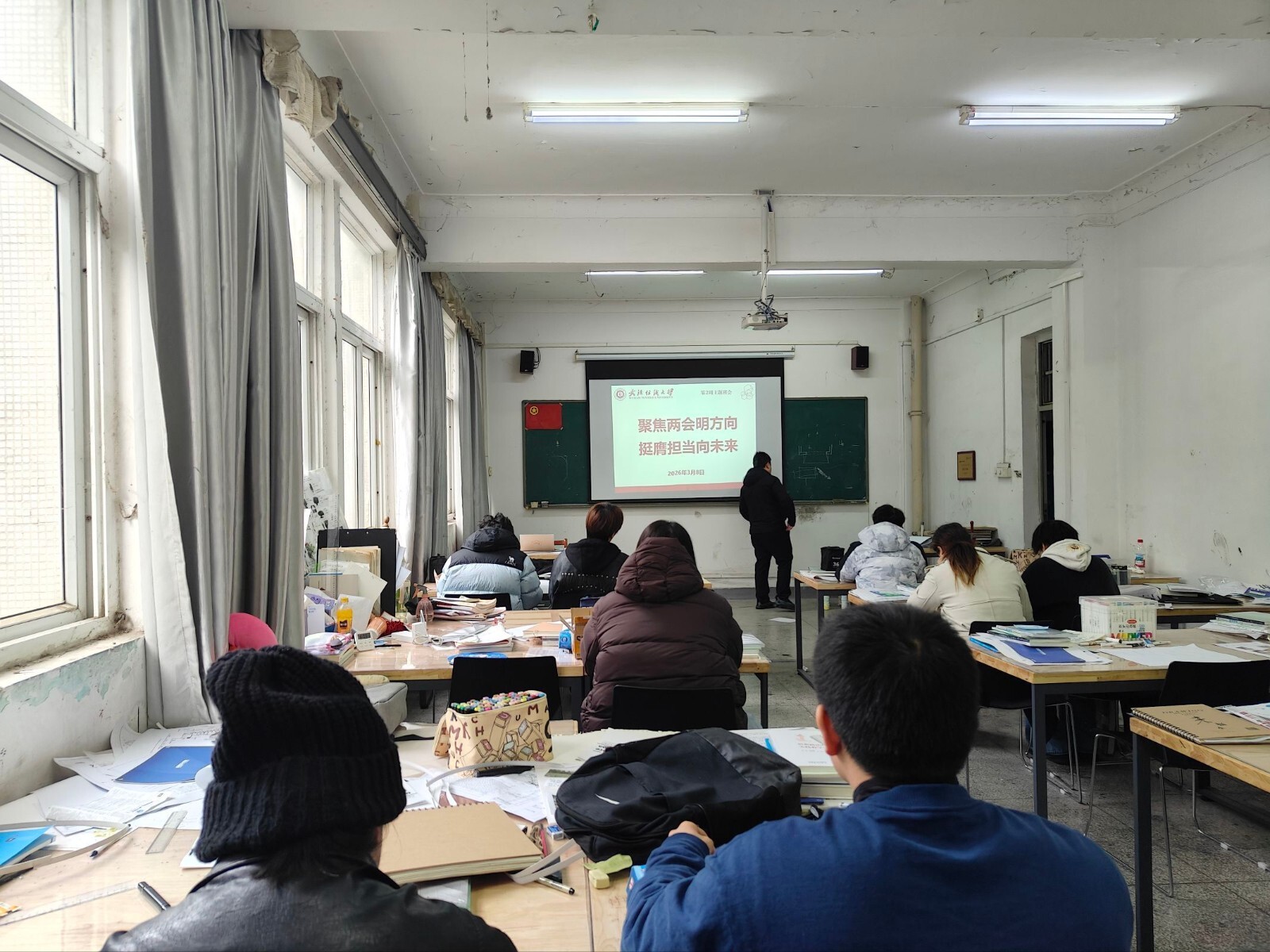 会上,各班班主任组织同学们深入学习2026年全国两会精神,聚焦五大“关键词”解读今年两会热点,带领大家回顾2025年我国经济社会发展成就,展望2026年国家发展的主要预期目标和政策方向。通过学习,同学们进一步理解了“中国式现代化”的深刻内涵,增强了投身强国建设、民族复兴伟业的责任感与使命感。随后,班主任结合武汉纺织大学“双一流”建设攻坚之年的战略部署,号召全体同学以主人翁姿态积极参与学校发展进程,将个人成长融入学校和国家发展大局。