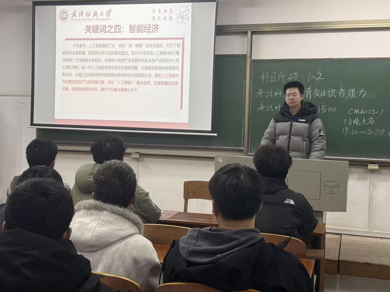 班会上,辅导员、班主任老师带领学生重温了今年全国两会的基本知识,回顾了2025年工作、“十四五”成就以及2026年经济社会发展总体要求。结合报告中关于“智能经济”的论述,引导学生围绕纺织行业数字化转型趋势,讨论人工智能、大数据、智能制造如何赋能传统纺织产业升级。