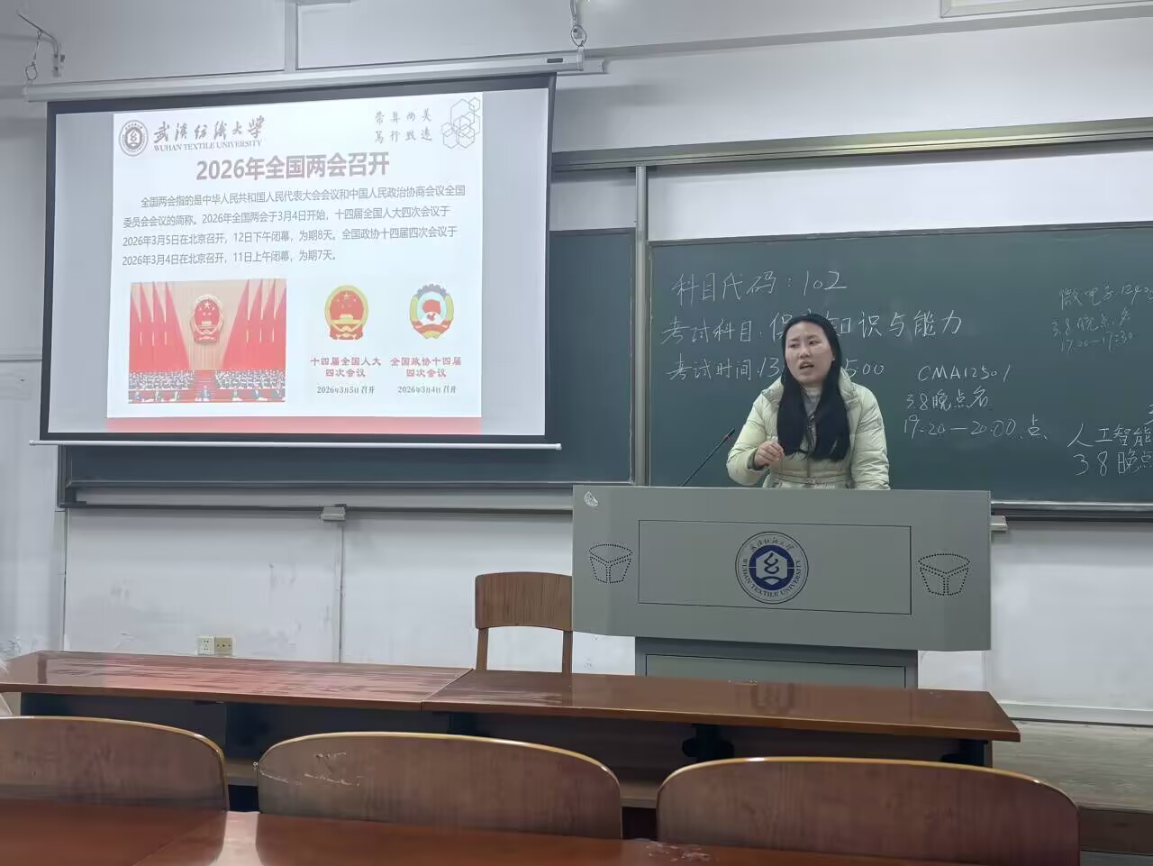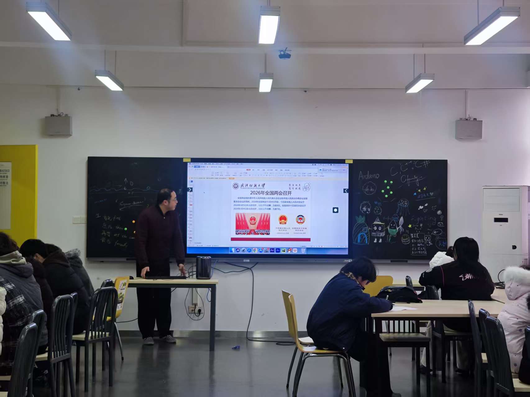 老师介绍了全国人民代表大会与中国人民政治协商会议的职能定位、会议议程与民主内涵,重点解读了2026年政府工作报告的核心内容,从五大“关键词”看2026年全国两会热点。详细阐释了“十五五”开局之年的国家发展重点方向,聚焦报告中的“青年元素”,围绕高校毕业生就业支持政策、青年人才引育、学科专业动态调整、创新创业扶持等内容展开深度解读,引导学生读懂两会传递的国家发展信号,将个人理想融入国家发展大局。