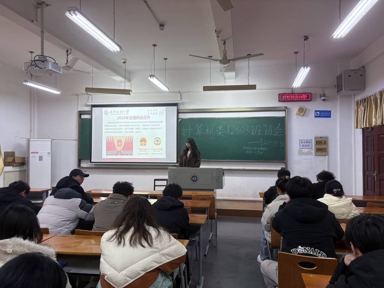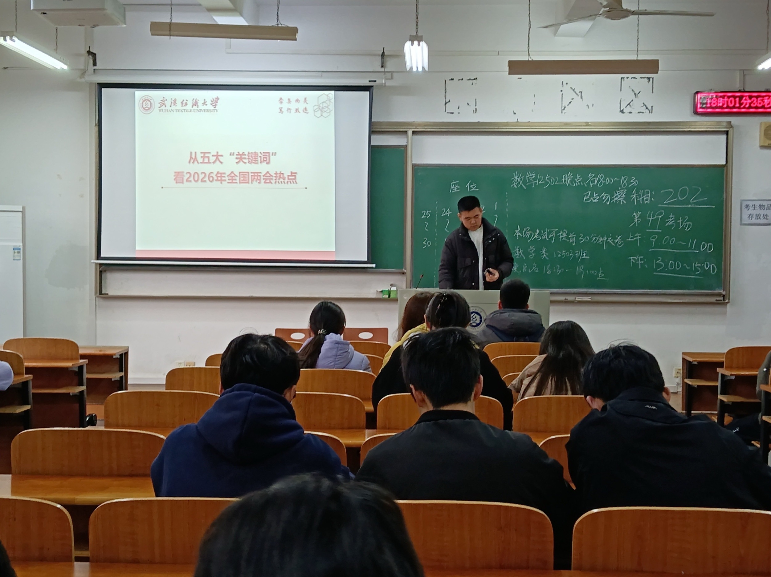 为了让全体同学共同聚焦全国两会,领会国家发展蓝图,数学与统计学院于3月8号在各班教室开展了以“从五大‘关键词’看2026年全国两会热点”为主题的班会活动。班会由各班班长主持,全体同学参与学习。