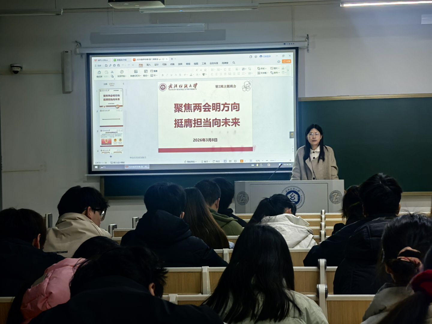 为持续深化新学期思政教育与日常管理,引导学生厚植家国情怀、养成健康文明习惯,3月8日,武汉纺织大学服装学院各班级有序召开新学期第二周主题班会,融合两会精神学习、学生日常管理、爱国卫生运动三项重点内容,多措并举引领青年坚定理想、涵养品行、健康成长,全力护航学生全面发展。