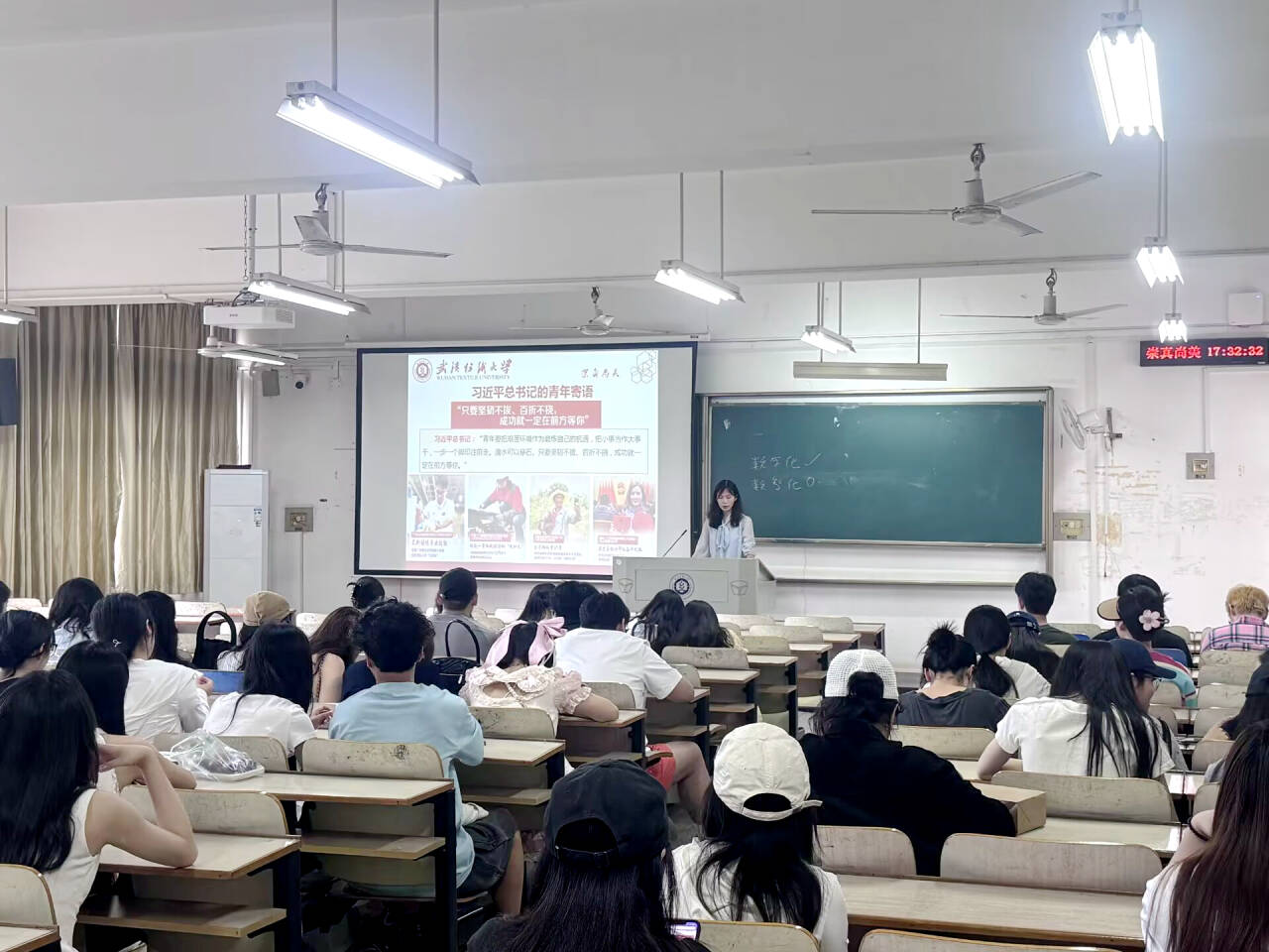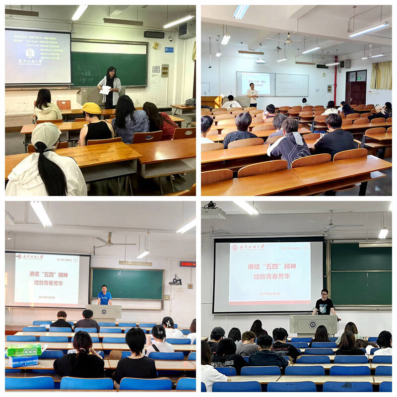 班会还介绍了众多当代青年榜样,如 “中国青年五四奖章” 入围者中的科技先锋杜灵杰、大国工匠冯攀龙等,他们在各自领域的卓越成就诠释了五四精神的时代价值。同时,武汉纺织大学的优秀青年师生代表也成为大家学习的典范。学校纺织新材料与先进加工全国重点实验室研究团队荣获 2025 年 “湖北青年五四奖章集体”,该团队青年占比 91.4%,在纺织新材料科技创新领域成果斐然,参与多项国家重大项目,助力航天工程等关键领域发展。此外,学校 2024 年度 “青年五四奖章” 获得者刘学琴、张晓芳等教师,以及 “青春力量・感动纺大”2024 年度十佳榜样人物韩秀、曹子翔等学生,他们在科研创新、教书育人、学科竞赛、社会实践和创新创业等方面表现突出,展现出纺大教师与学生的奋斗风采。