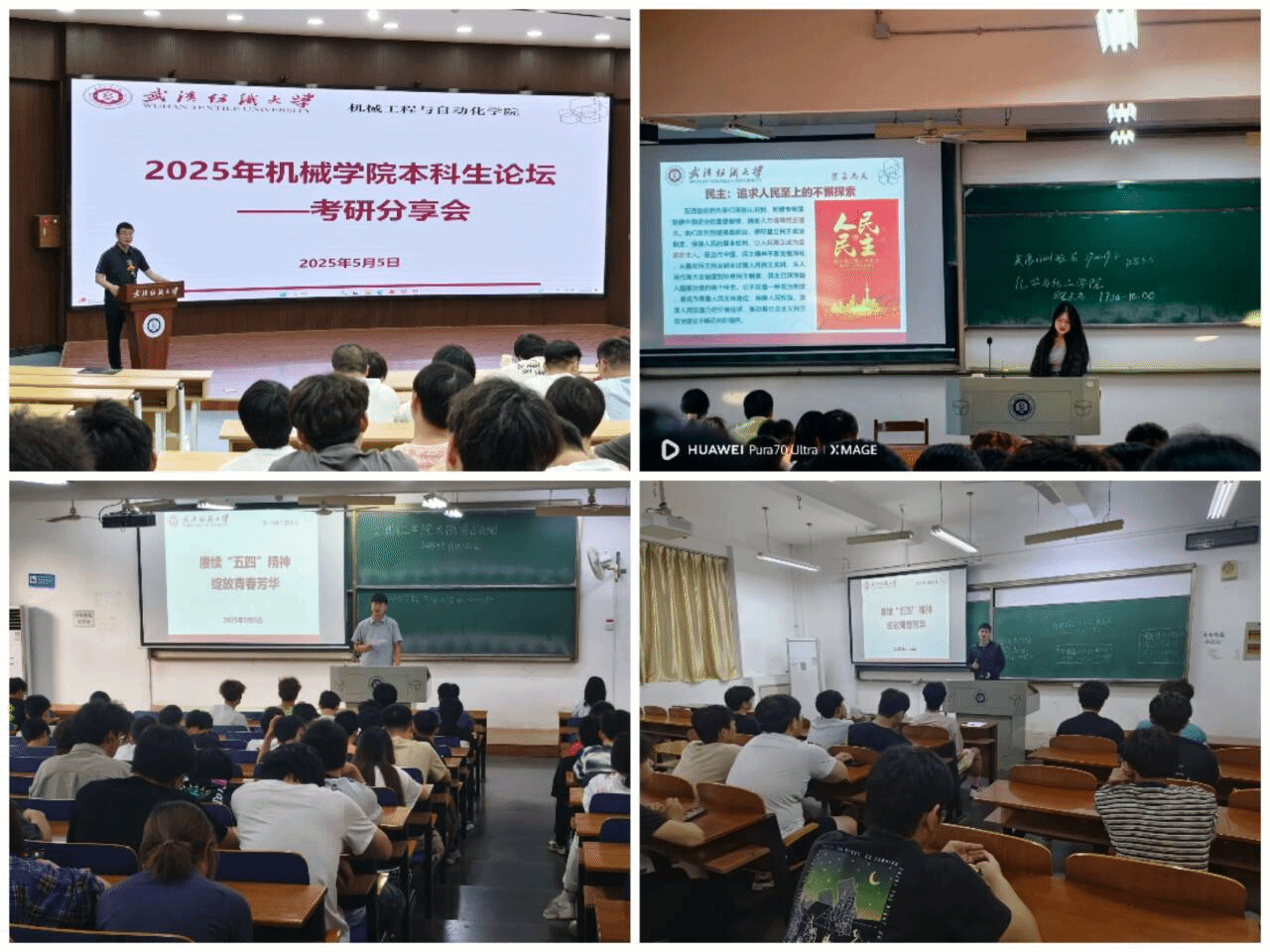 5月5日,机械学院开展“赓续五四精神 绽放青春芳华”主题班会,本次班会由各年级辅导员、班主任主持,全体学生参加。此次活动旨在结合学校青年榜样人物风采展示,宣传爱国、进步、民主、科学的五四精神内涵,鼓舞学生追求理想、追求进步,为中华民族伟大复兴而拼搏奋斗。