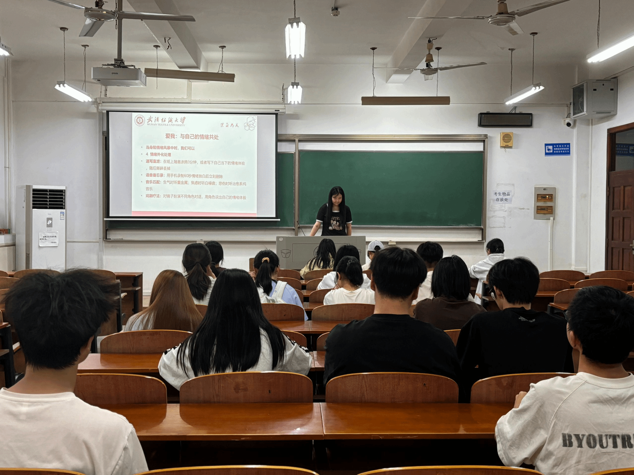 班会上老师列举了大学生常见的情绪困扰,如学业高压、社交冲突、未来焦虑、情感波动等,并分享了生理调节、多重感官刺激、运动调节、寻求社会支持等多种情绪应对方法。最后班会还介绍了学校五月“我爱我”系列活动,包括宿舍主题活动、自我心理测评、心理知识竞赛等,鼓励同学们积极参与。