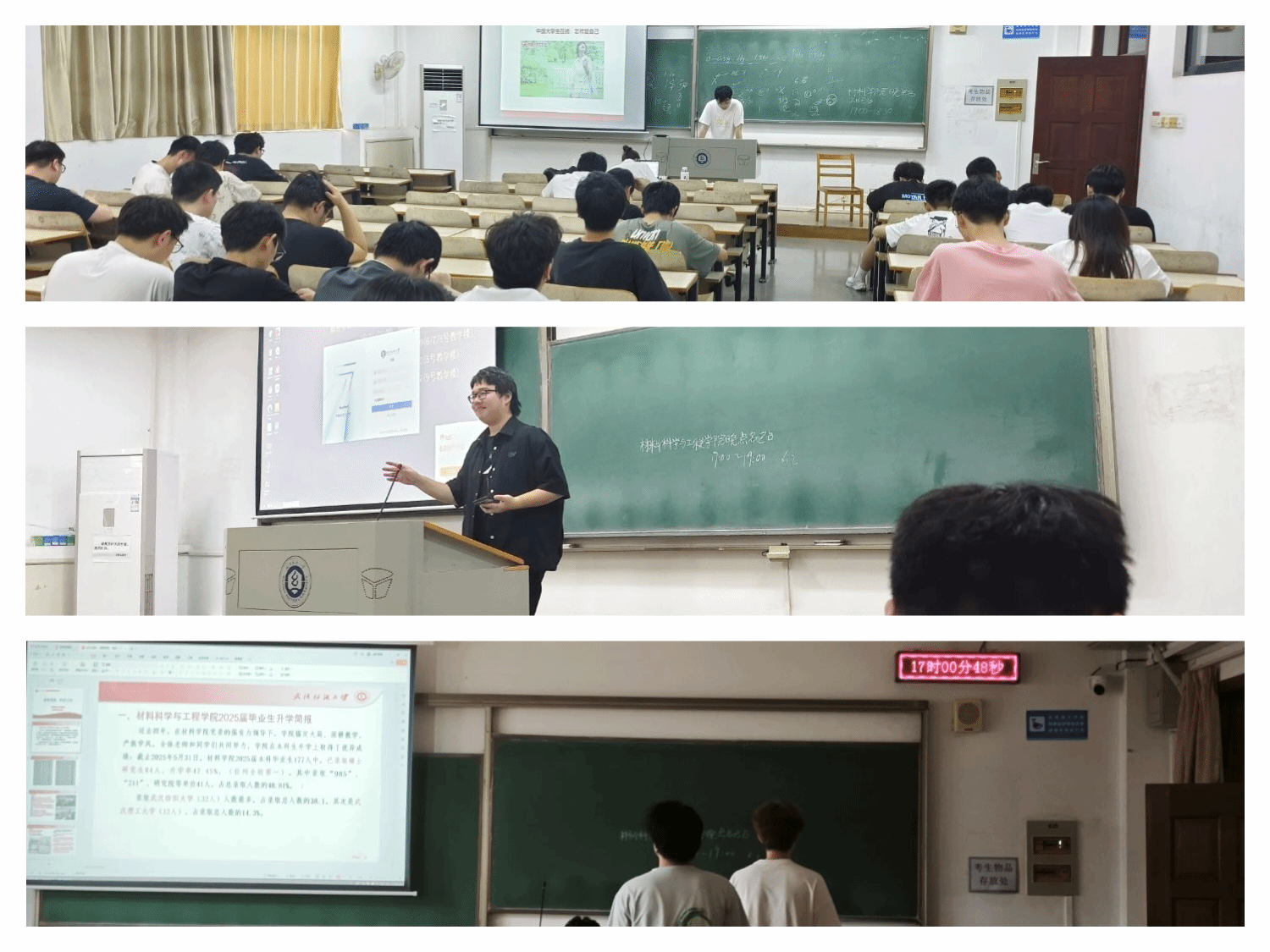 班会伊始,辅导员和班主任们展示了多位在就业和考研方面取得优异成绩的毕业生代表,在校期间获得的各类奖学金、竞赛奖项等学术成就。
