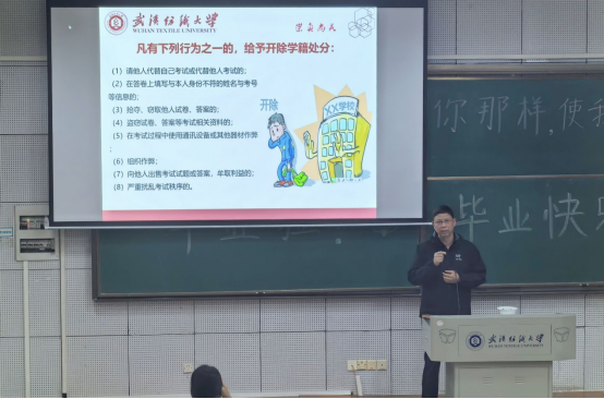 各年级老师通过分享优秀毕业生考研上岸、高质量就业的典型经验,引导同学们提前规划、坚定目标、逐步圆梦。同时,结合期末考试和英语四六级考试,开展诚信应考教育,深入剖析考试作弊、学术不端等行为的危害,详细解读《武汉纺织大学学生考试违纪处理办法》及典型案例,强调诚信考试的严格要求,引导学生树立“诚信为本”的应考理念。